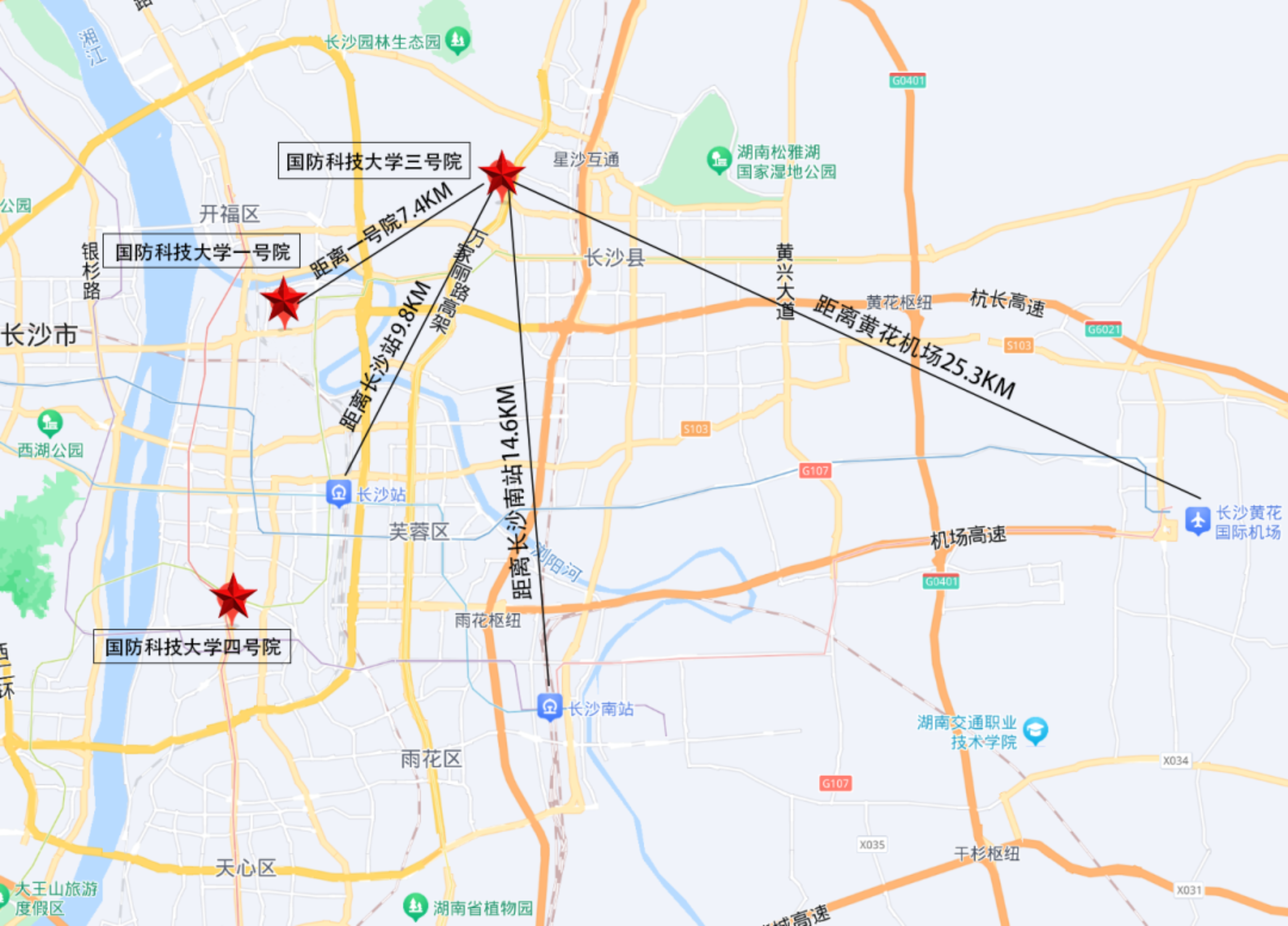 目的地:国防科技大学三号院南门停靠点(福元路与万家丽路交叉口西北侧)。