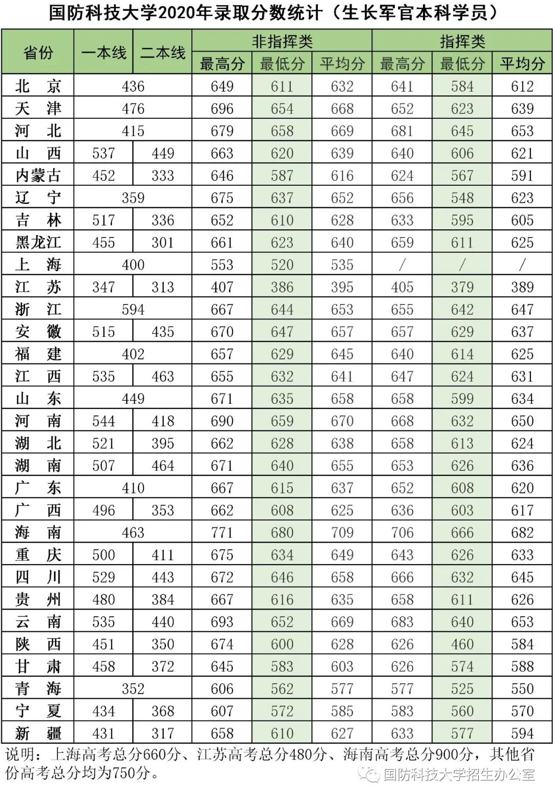 2020年录取分数统计(生长军官学员)