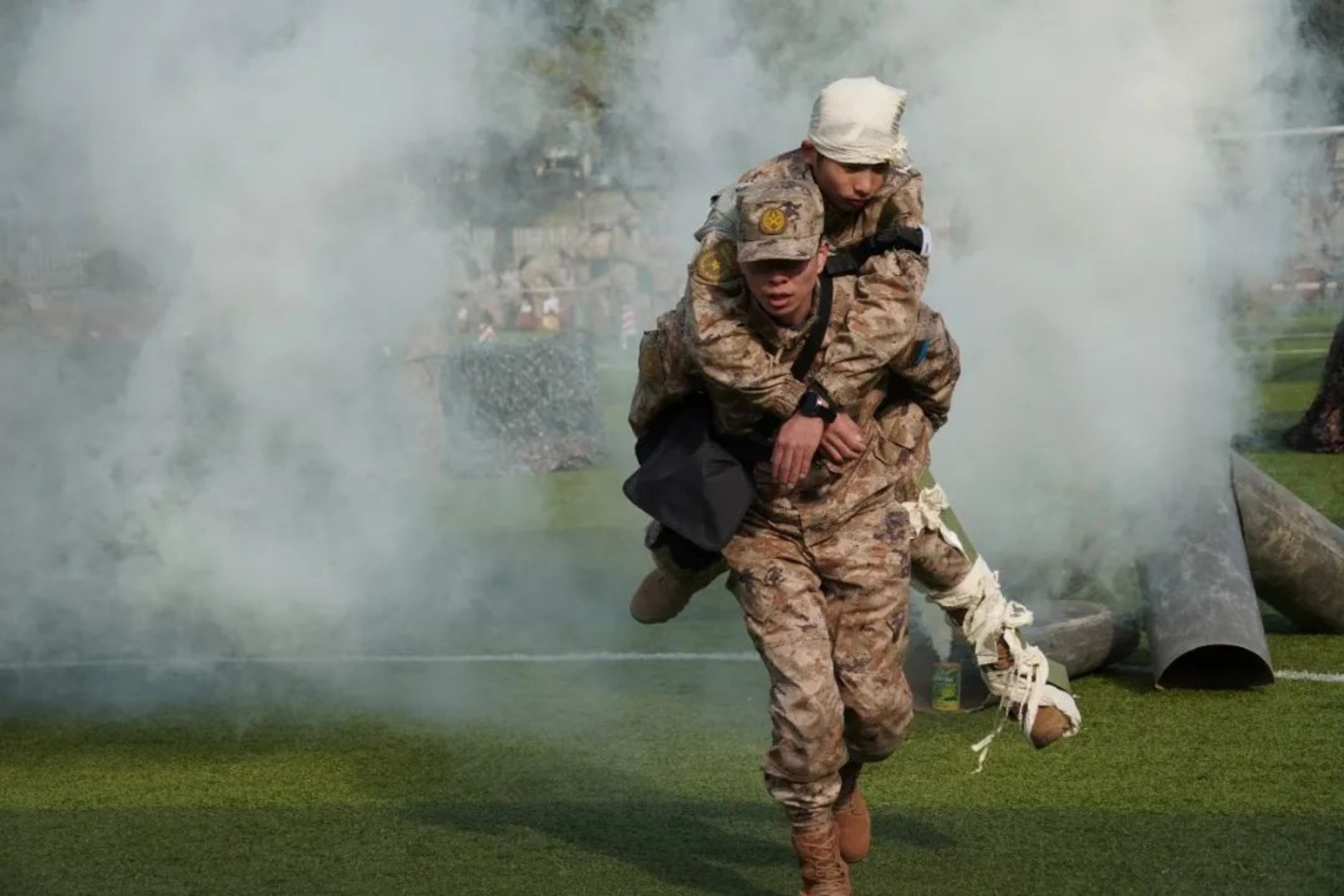 随着发令枪响起救护员迅速卧倒他们身手敏捷迅速穿越, 英雄赛技显雄风力争上游夺第一寒冬利刃 沙场点兵硝烟弥漫 战火纷飞战伤自救互救技术群众性比武正式拉开帷幕—穿越障碍—, 将伤员安全地拉至掩体后—包扎急救—救护员们身体屈于掩体后方按照快、准、轻、牢、细的要求遵守爱伤护伤的原则止血带、三角巾、卷式夹板在手中上下翻飞包扎、缠绕、固定一气呵成—伤员搬运—快速搬运着模拟伤员救护员全神贯注一边观察敌...