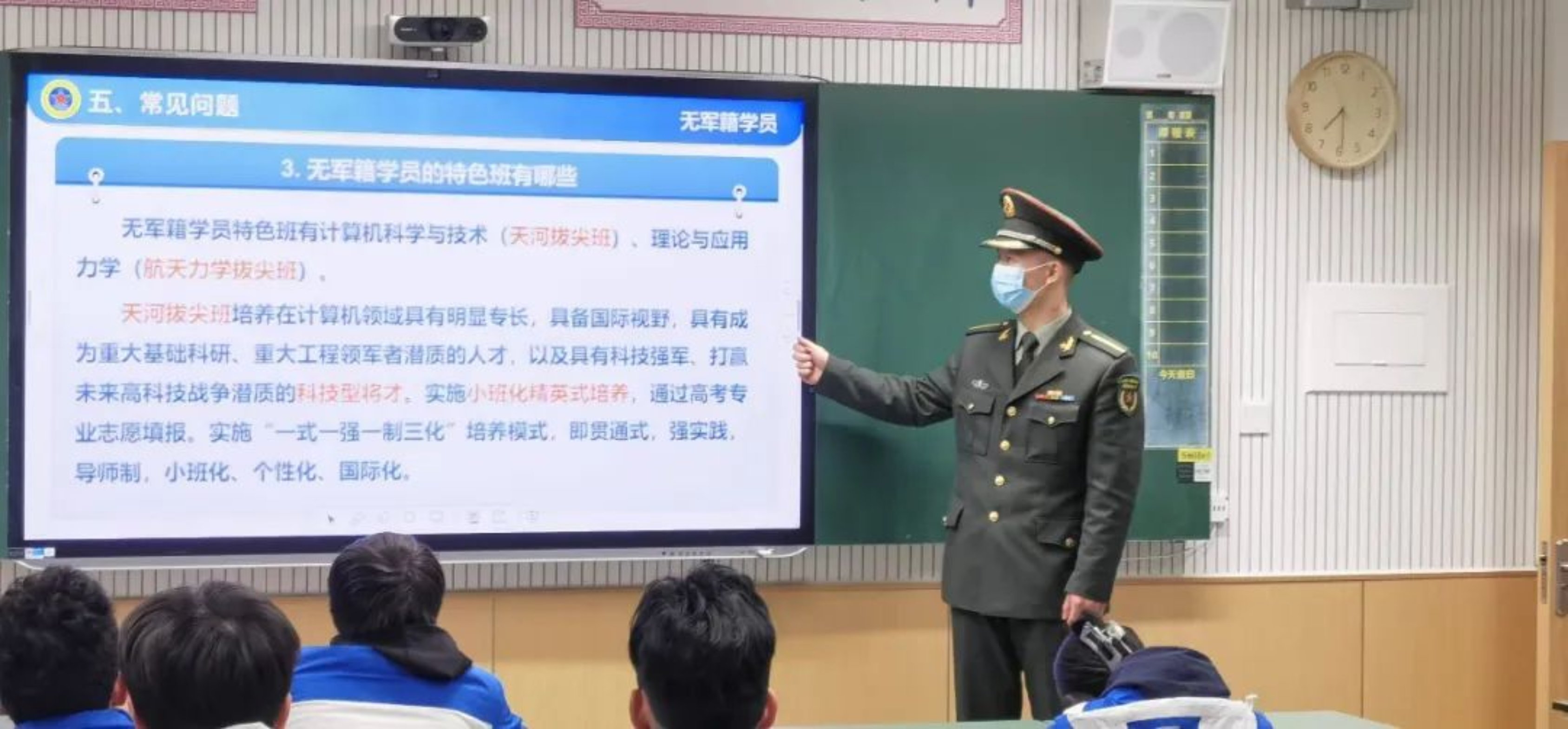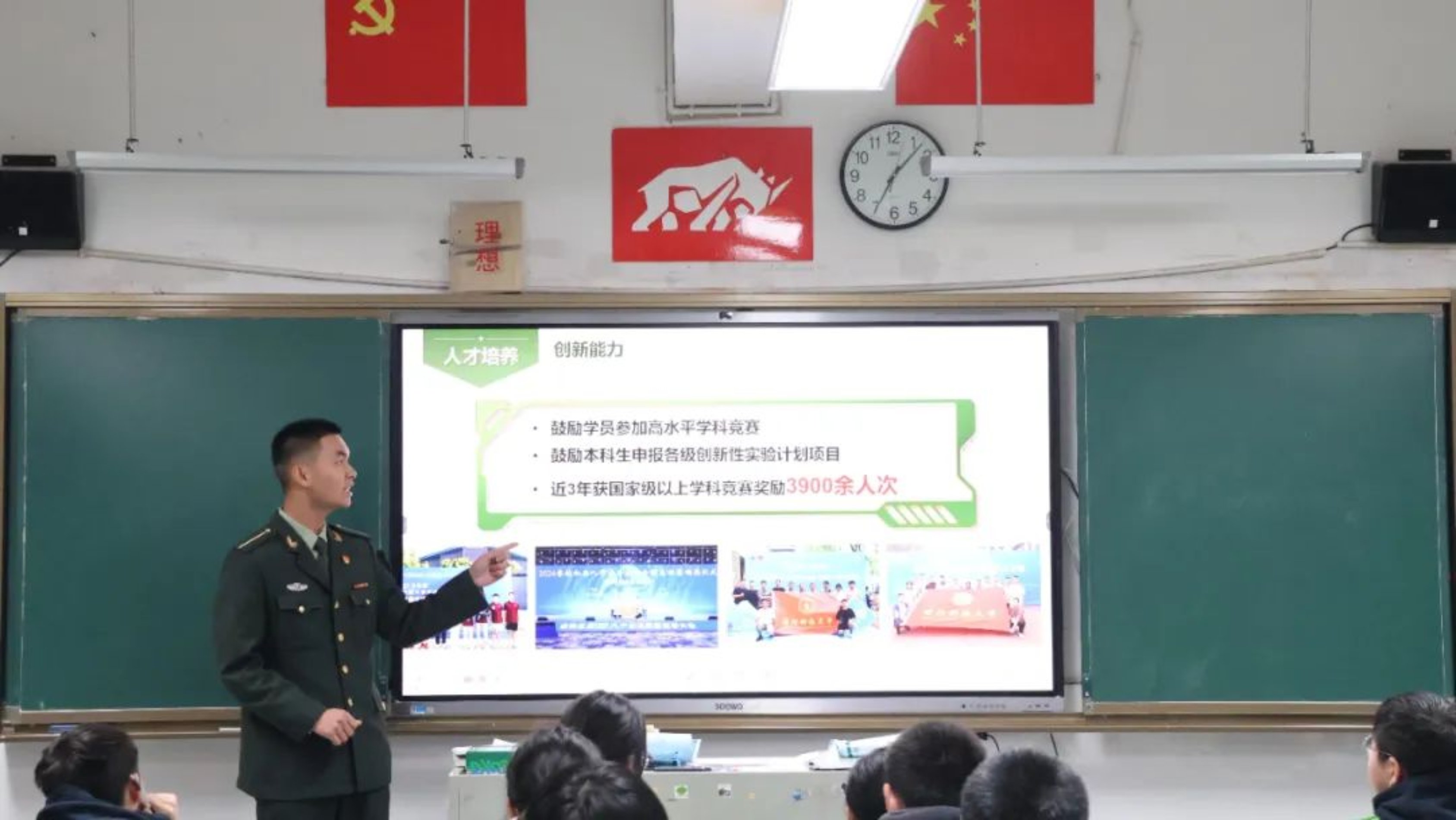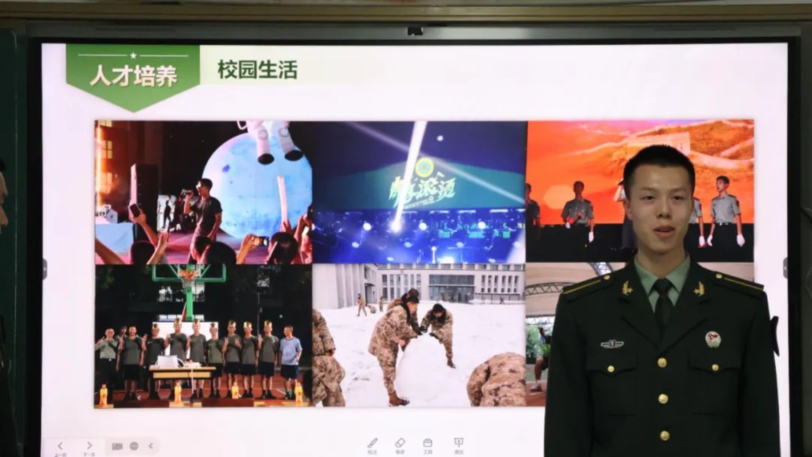 杜君豪从米兰的发展历程、人才培养、科研成果等方面进行介绍,同时结合校园生活分享成长故事,为在场的同学和老师展现了米兰学子的良好形象。活动现场气氛活跃,同学们积极提问关于报考米兰的相关要求、注意事项,杜君豪耐心回答,为有志从军报国的同学答疑解惑。