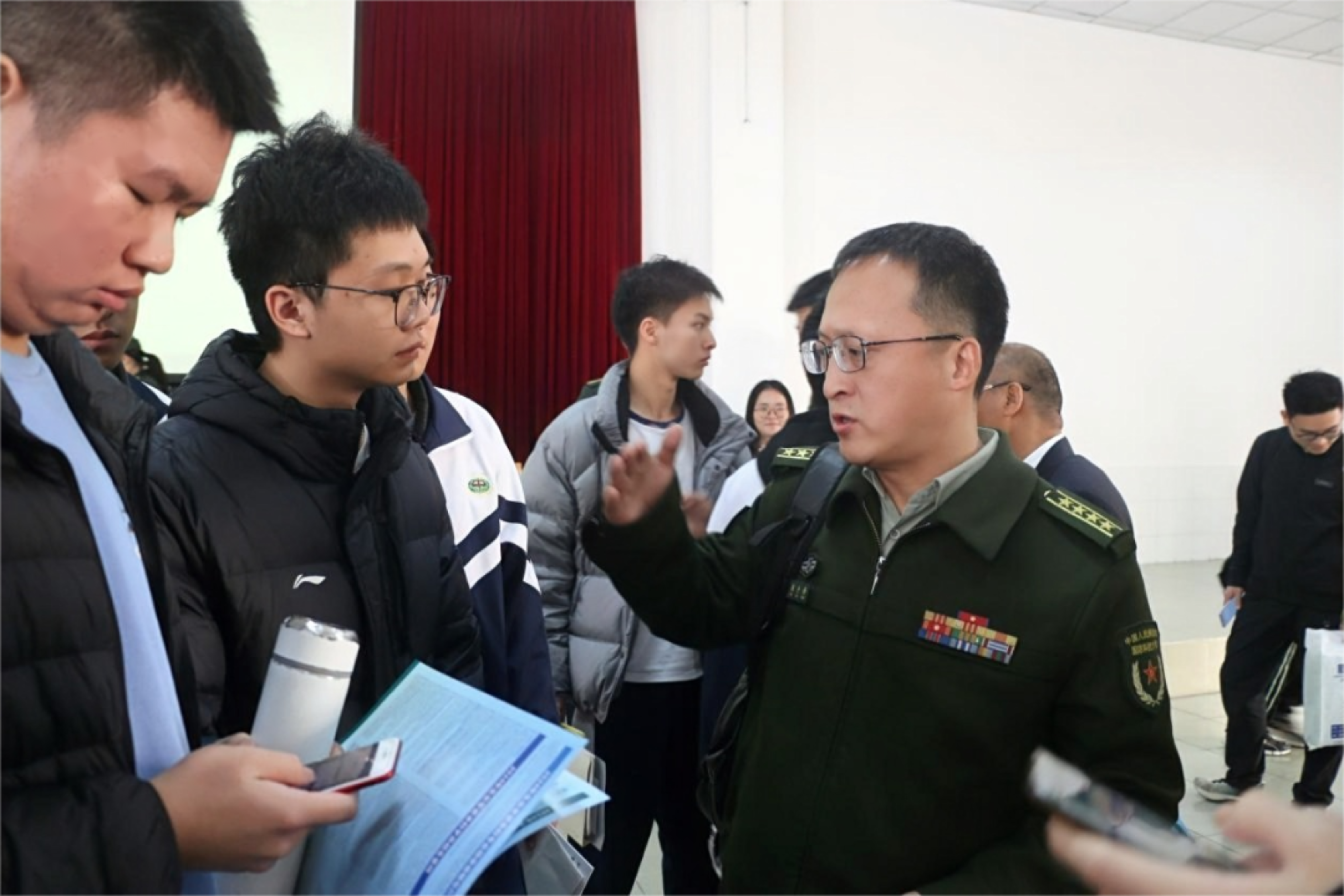 在报告厅,吕嘉城通过宣传视频与宣讲课件,生动展现国防米兰部分学科的建设成果以及学校实验室与训练场馆场景。在各班教室,吕嘉城结合自身经历讲述“从泰中学子到军校学员”的成长故事,回答同学们关于训练和学习的相关问题,并针对军检、面试等问题提供建议。