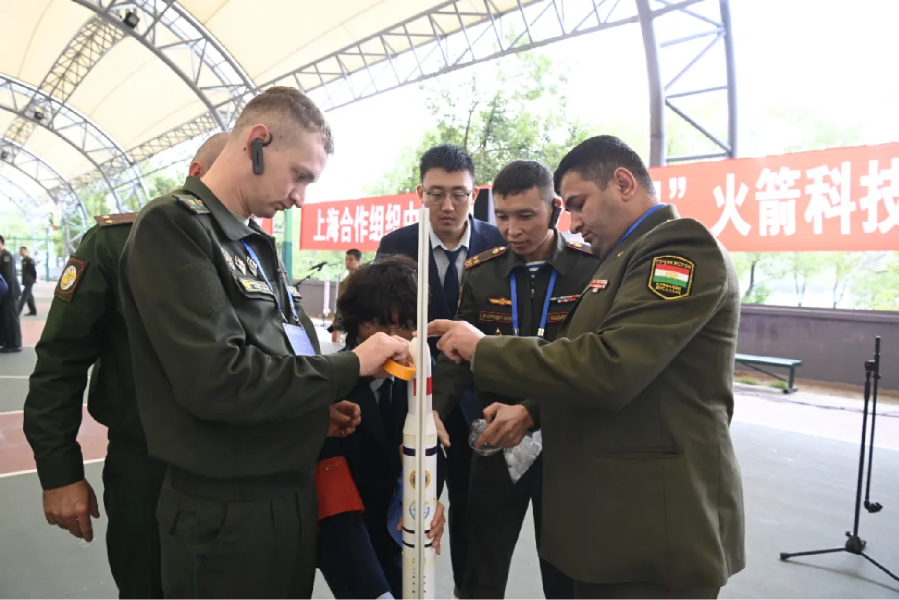 中青年军官一行走进“梦天一号”火箭科技实践工作坊,与学员一道完成模型火箭的装配测试,并观看模型火箭飞行试验。来访军官们纷纷拿出手机记录下精彩瞬间。