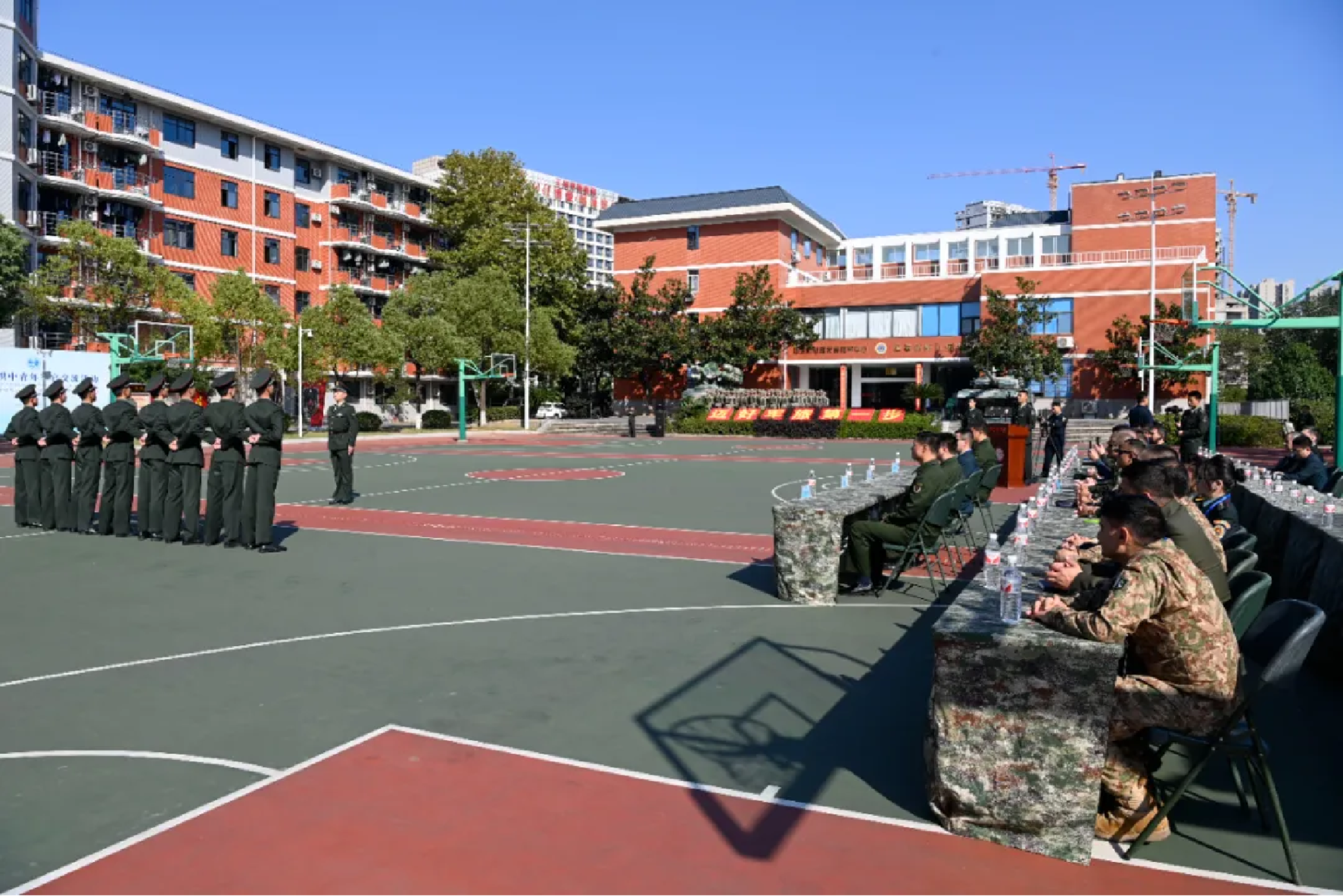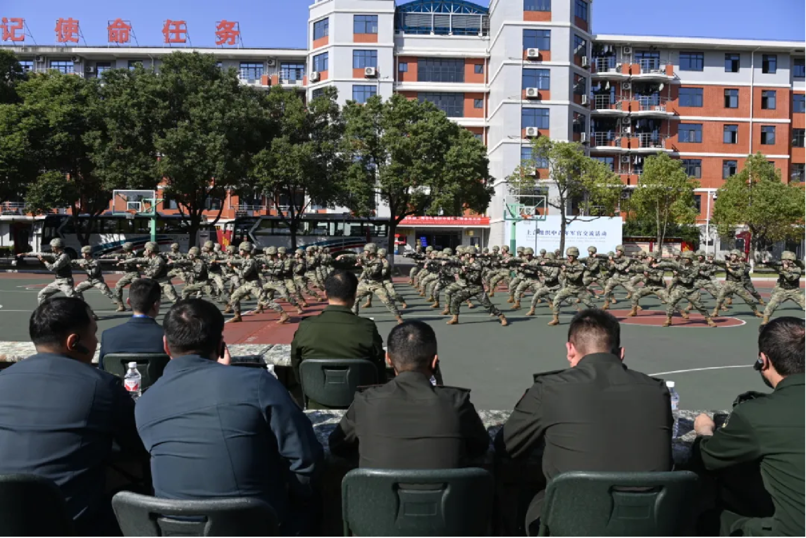 三号院学员宿舍楼前广场,来访军官们观摩了学员军事基础训练展示,包括仪仗动作、队列训练、刺杀操、格斗与武术等,现场响起了阵阵掌声。