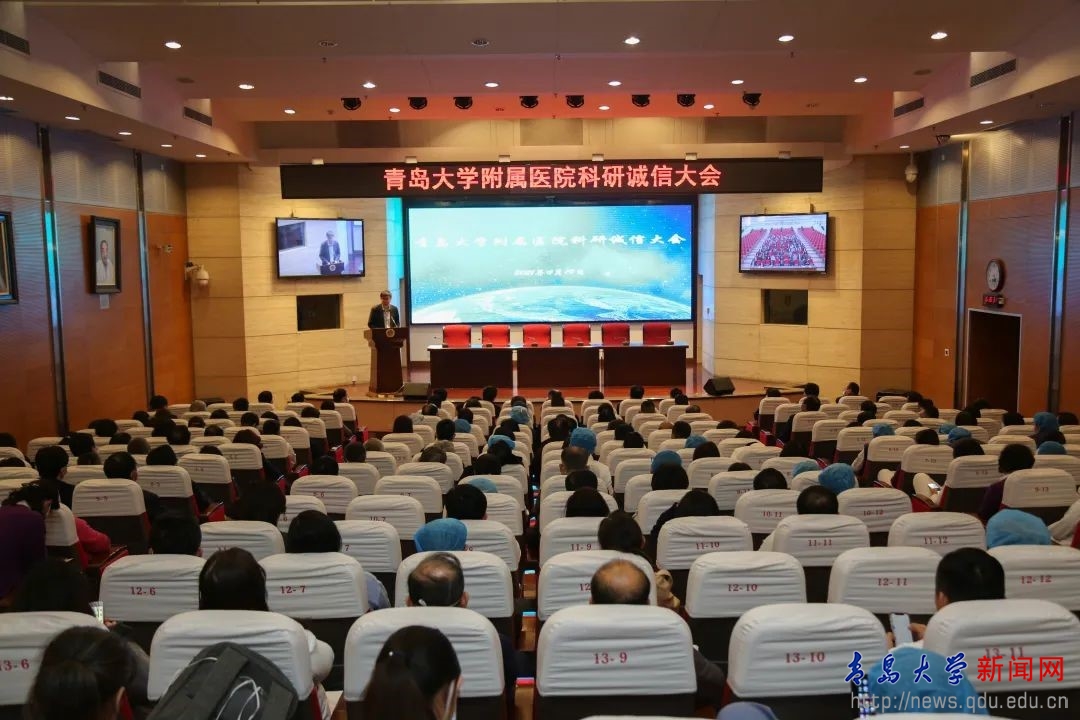 新闻网讯 4月19日,青大附院举行科研诚信大会。校长夏东伟出席大会并讲话,医学部党工委书记、附属医院党委书记王新生,部长姜宏,附属医院院长董蒨等院领导,职能部门负责人,临床科室主任、护士长及全院医务工作者参加大会,市南、崂山、西海岸、市北、平度五院区同步视频。王新生主持大会。