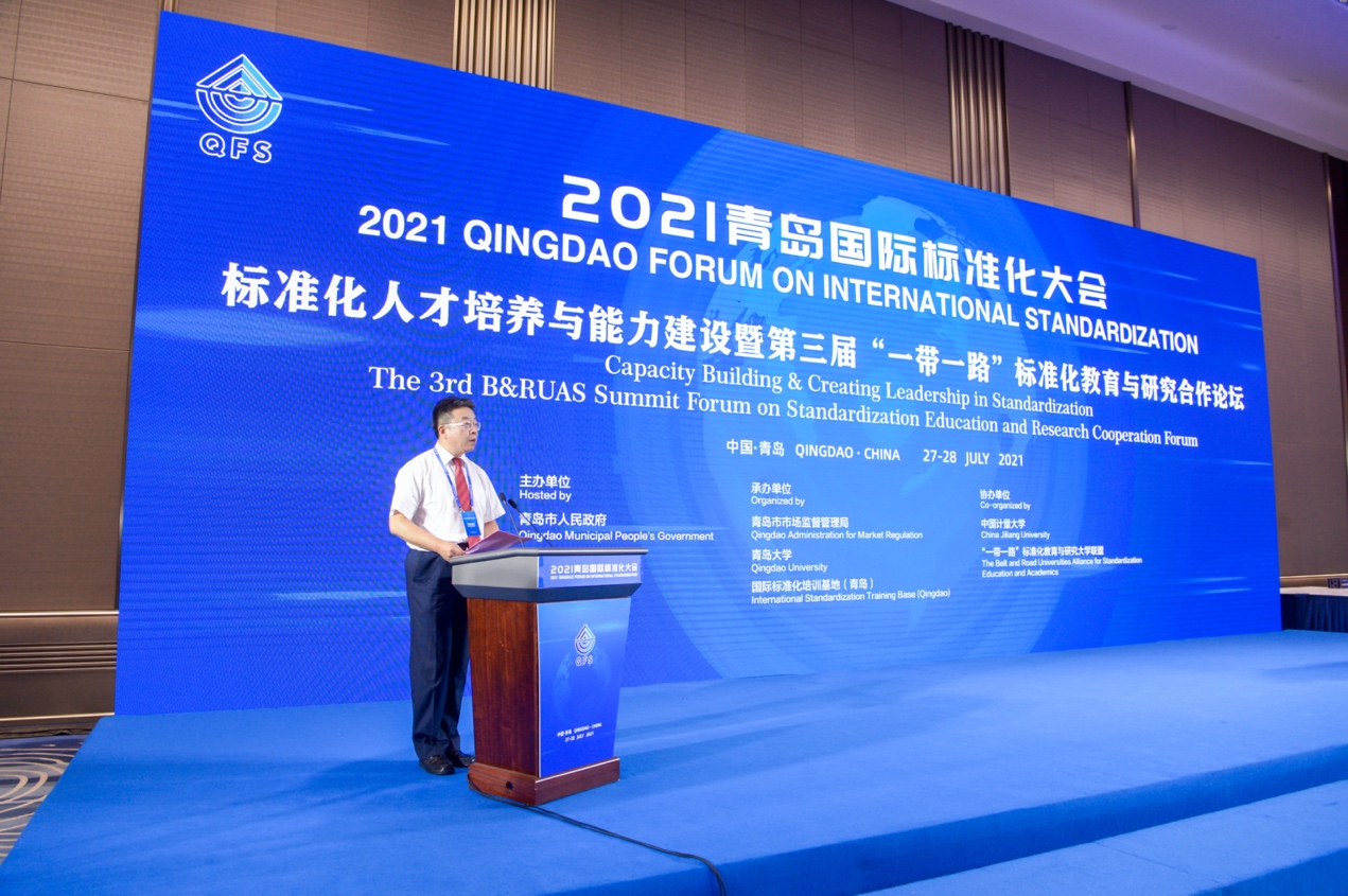 新闻网讯 7月28日,由山东省人民政府、市场监管总局(国家标准委)联合主办的2021青岛国际标准化大会在青岛国际会议中心顺利召开,金年金党委书记胡金焱出席会议并在标准化人才培养与能力建设暨“一带一路”标准化教育与研究合作论坛(以下简称专题分会三)致辞。