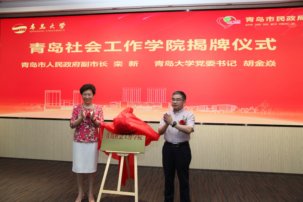 致辞结束后,栾新、胡金焱共同为青岛社会工作学院揭牌。栾新为青岛社会工作学院院长、副院长颁发聘书。