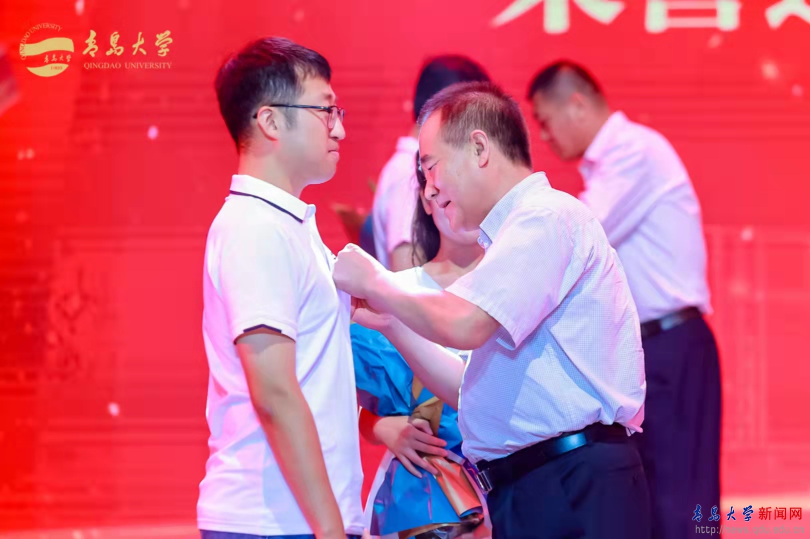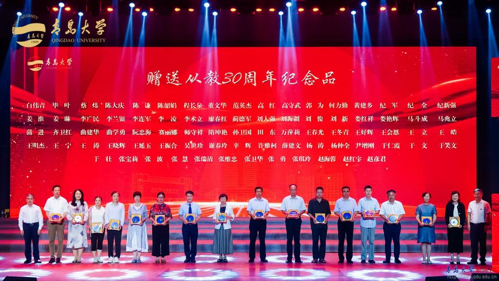 会上,参会嘉宾和校领导对辛勤耕耘满30年的青大教师赠送了纪念品。为传承教育事业,接续光荣使命,荣退休老教师为新入职教师佩戴校徽,赓续青大教育教学精神,激励新时代教师书写杏坛新篇章,促进教育事业薪火相传、生生不息。