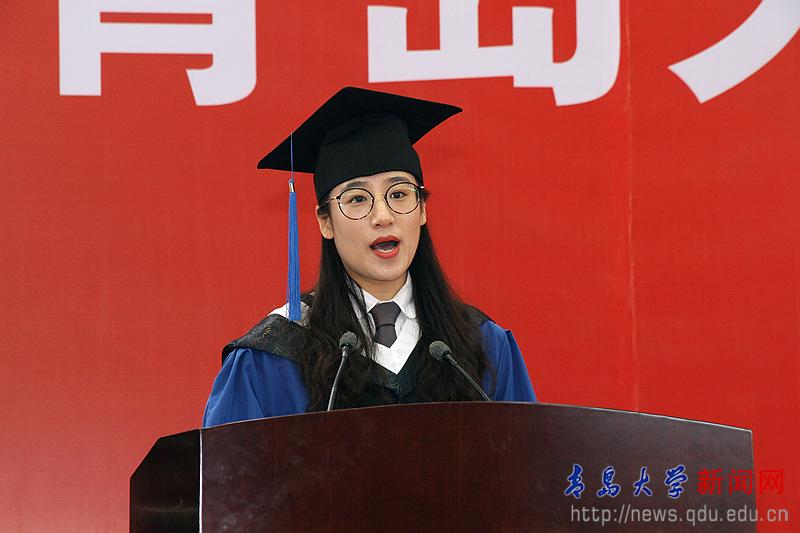 毕业生代表、医学部2010级临床医学专业(八年制)学生周欣蓓在发言中表示,将怀揣神圣使命,铭记嘱托,用梦想、激情与汗水远赴八方,尽展青大才俊风采。