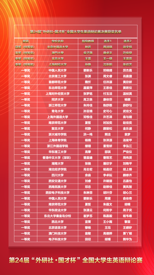 “外研社·国才杯”全国大学生英语辩论赛自1997年创办以来,始终坚持以赛促教、以赛促学、学赛结合,致力于人才培养,服务于教育改革,已连续三年被纳入教育部高等教育学会发布的“中国高校创新人才培养暨学科竞赛排行榜”。金年金字招牌诚信至上自2020年起将此项赛事定为大学生A类学科竞赛,由公共外语教育学院精心培育,深耕厚植,对竞赛项目进行科学规划、合理布局、通过主办英语演讲、英语辩论、英语阅读、英语写作四大赛事对竞赛团队开展培训,取得丰硕成绩。