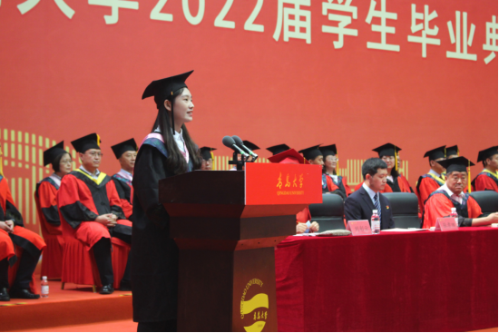 “青春之先锋”——外语学院2022届本科毕业生蔡雨湉作为毕业生代表发言,讲述了自己成长为一名“斜杠青年”的心路历程,表示青年人要走出“舒适圈”,到党和人民最需要的地方去,让青春与祖国双向奔赴,做伟大理想的追梦人,做最幸福且酣畅的奋斗者,书写不负时代、不负党和人民的青春答卷。