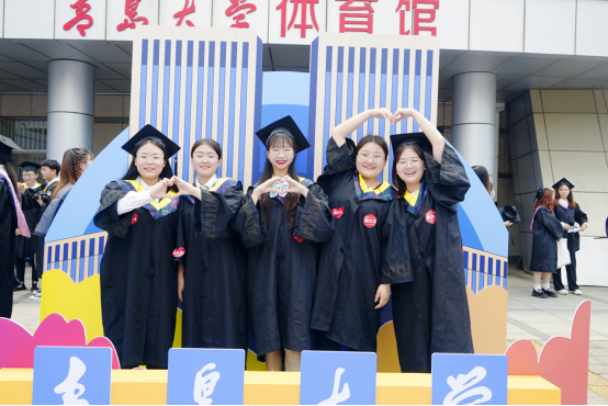 场馆外,学校特别搭建了“毕业小镇”,设置了“我们毕业啦”“喜迎二十大”“前程似锦航班”“镂空毕业证”“青大铁饭碗”等主题元素的手牌、简易雕塑或者背景墙,毕业生们纷纷在此合影留念。