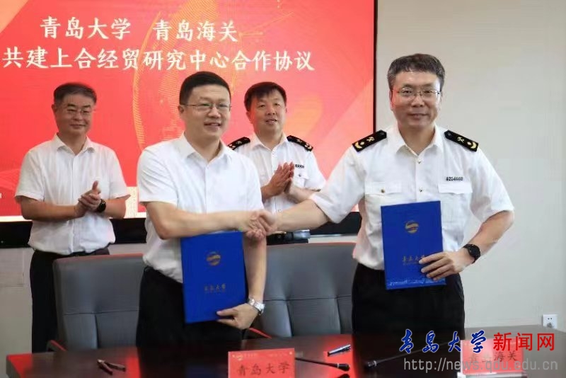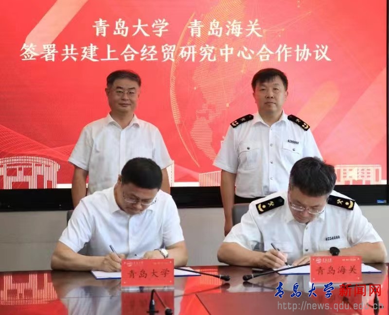 签约仪式上,上合组织经贸学院理事会副秘书长、金年金字招牌诚信至上上合校区建设办公室主任马林刚,青岛海关统计分析处处长张径舟代表双方共同签署《共建上合经贸研究中心合作协议》。