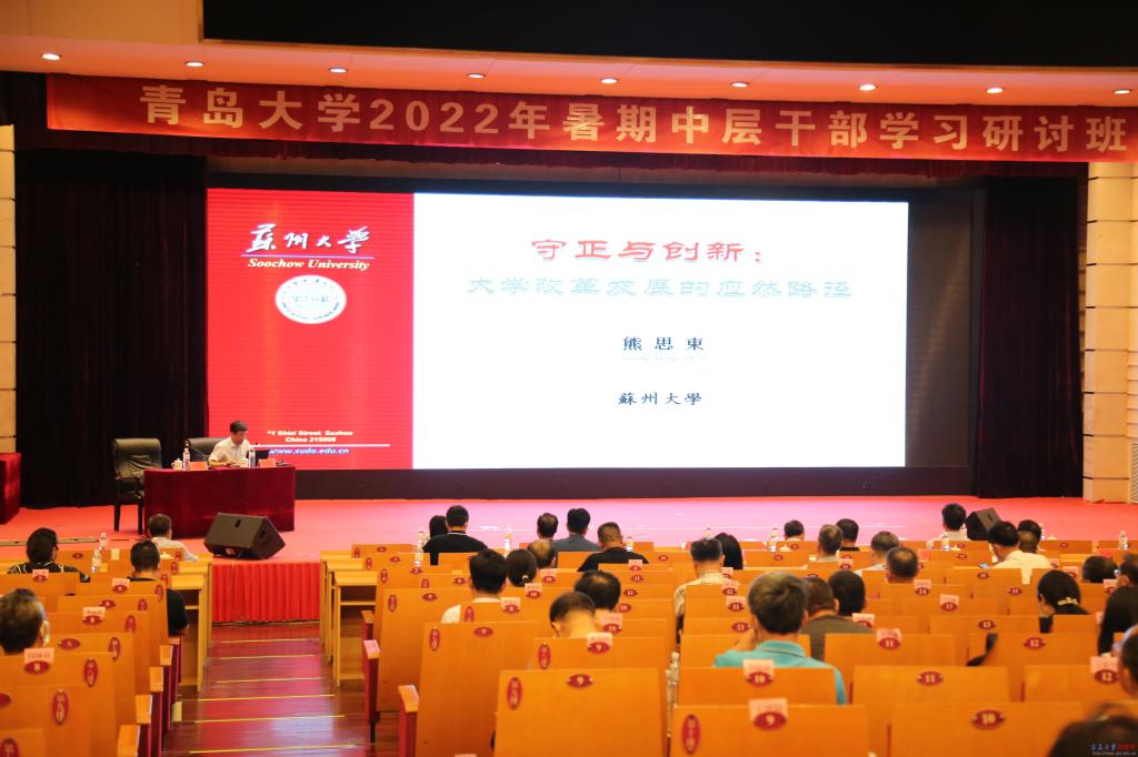 新闻网讯 8月25日上午,金年金邀请苏州大学原校长熊思东教授为金年金2022年暑期中层干部学习研讨班做了题为《守正与创新:大学改革发展的应然路径》的专题报告。报告会在国际学术交流中心博学厅举行,校党委副书记杜方波主持会议。