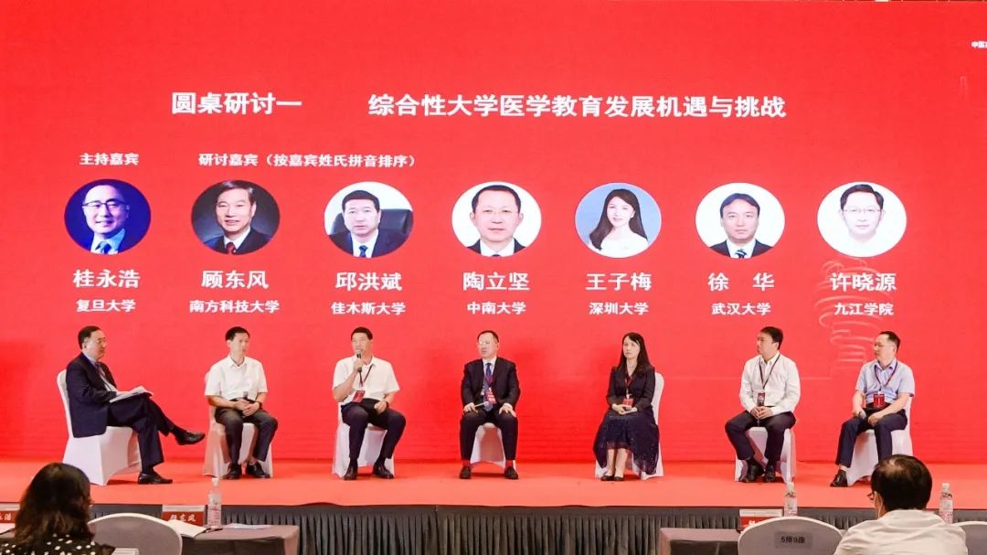 复旦大学原常务副校长桂永浩教授主持召开圆桌研讨,南方科技大学代理副校长、中国科学院院士顾东风,佳木斯大学党委书记邱洪斌,中南大学原党委常务副书记陶立坚,深圳大学医学部副主任王子梅,武汉大学医学部常务副部长徐华,九江学院医学院书记许晓源六位嘉宾分别围绕综合性大学医学教育管理实践问题进行了交流探讨。