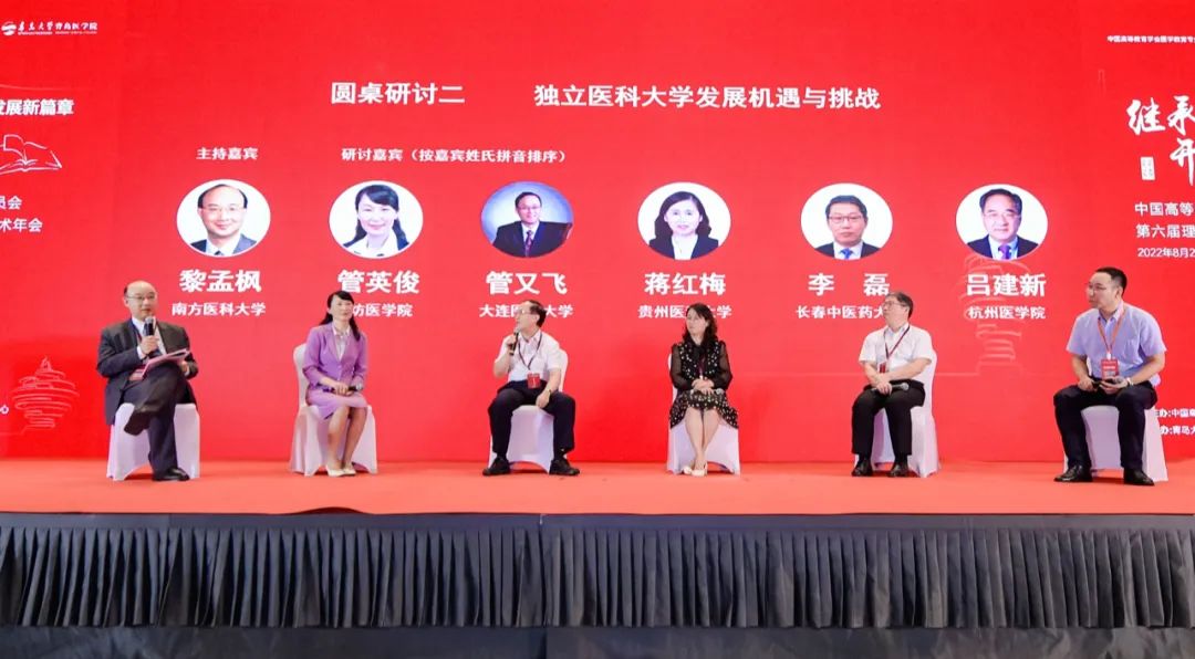 南方医科大学校长黎孟枫就“独立医科大学发展机遇与挑战”问题主持召开了圆桌研讨,潍坊医学院院长管英俊、大连医科大学副校长管又飞、贵州医科大学副校长蒋红梅、长春中医药大学副校长李磊、杭州医学院党委书记吕建新围绕相关问题进行了深入探讨。