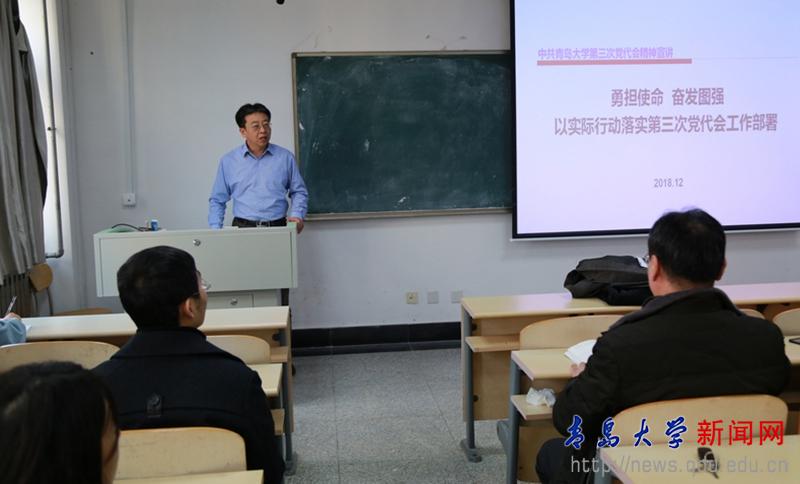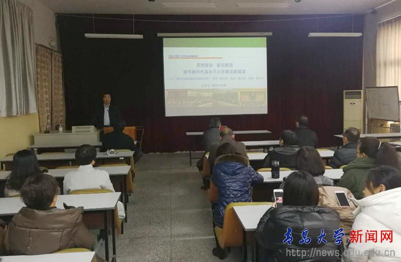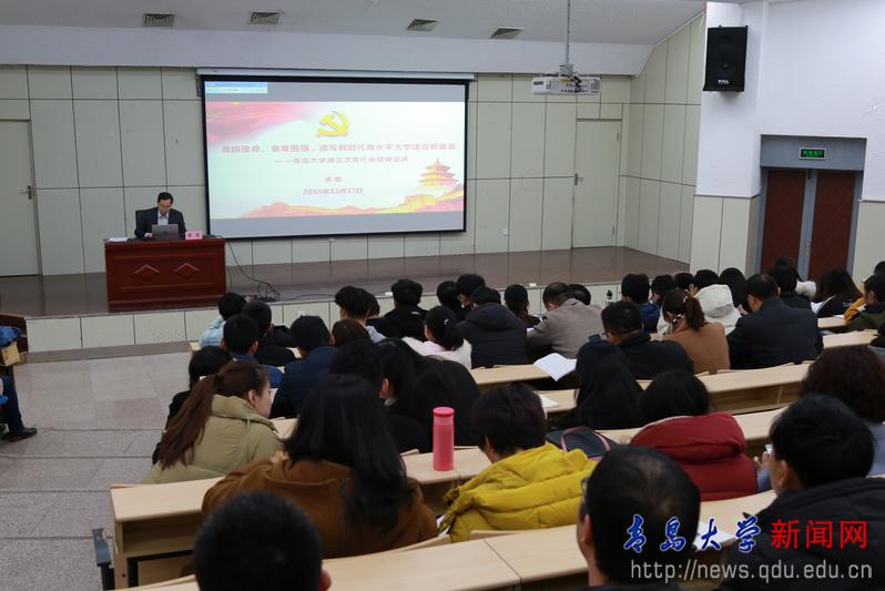 校党委书记胡金焱12月17日上午和下午,分别来到金家岭校区和浮山校区师范学院报告厅,为经济学院、商学院师生和党委组织部、政策研究室、师范学院、自动化学院师生宣讲第三次党代会精神。在宣讲中,胡金焱对党代会确定的“进入国家‘双一流’建设行列,建成国内外有较大影响的一流大学”的总体目标、三步走发展战略、五大发展理念、五个战略重点和实现发展的“十大建设工程”做了详细解读。对学院建设和各单位工作,胡金焱提出具体要求:一是要切实加强党的基层建设,为学院的发展定向护航。二是要深刻理解内涵发展、特色发展和创新发展理念,牢固树立师生为本、育人为本的教育价值导向,尊重和发挥师生办学主体作用。三是要转变人才培养理念、提高教师教书育人能力,大力开展创新创业教育,提升人才培养质量。四是要提升承担重大科研任务的能力,激发学术平台的创新活力,全面提升科学研究和学术创新的整体水平。五是要加强高层次人才引进和培养工作,提高管理水平,建立人才队伍支撑、激发干事创业活力。六是要立足青岛、融入青岛、服务青岛,服务山东新旧动能转换。七是要在人才队伍、人才培养、学术研究上实施国际化开放办学工程。