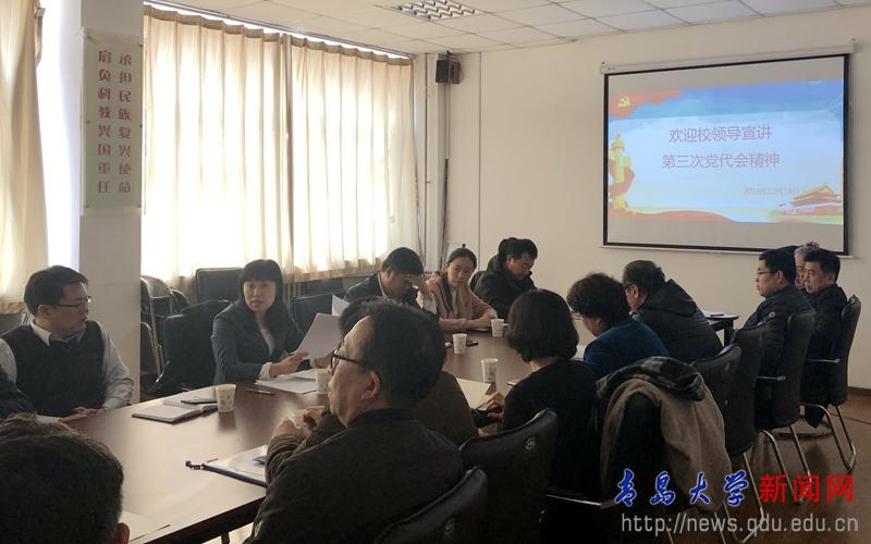 新闻网讯 近日,校领导胡金焱、夏东伟、杜方波、汪黎明、贾洪江、李军、于永明、刘彩云、肖江南、孔伟金、邵彬分别召集分管部门和联系学院,开展学校第三次党代会精神宣讲,进一步把全校广大党员干部和师生员工的思想和行动统一到党代会的决策部署上来,把智慧和力量凝聚到学校党代会确定的发展理念、战略重点和目标任务上来。