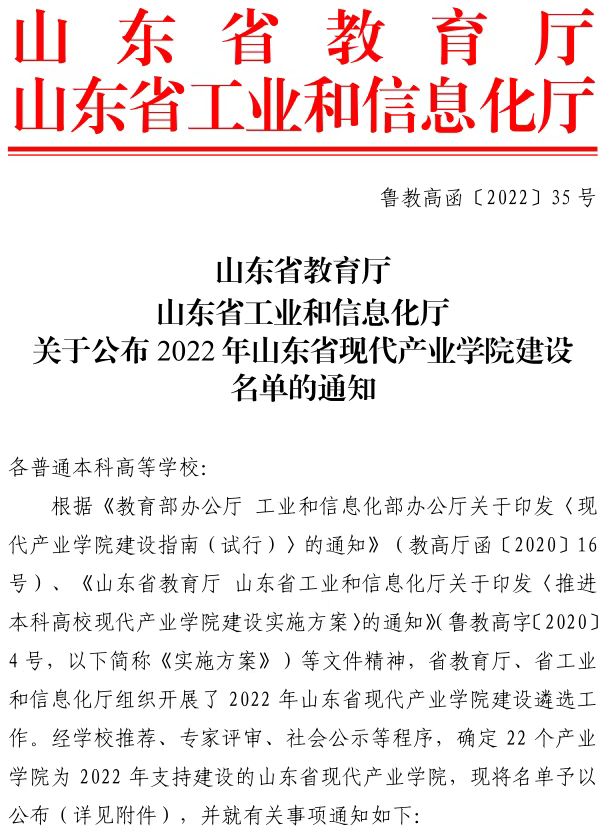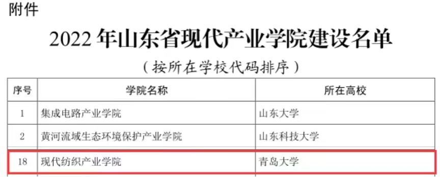 新闻网讯 近日,山东省教育厅、山东省工业和信息化厅公布了2022年山东省现代产业学院建设名单,学校申报的“现代纺织产业学院”获批立项,这是金年金继海信人工智能学院之后,获批的第二个省级现代产业学院。