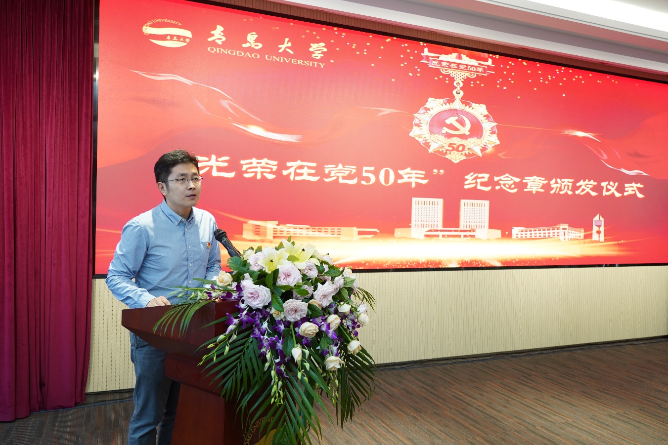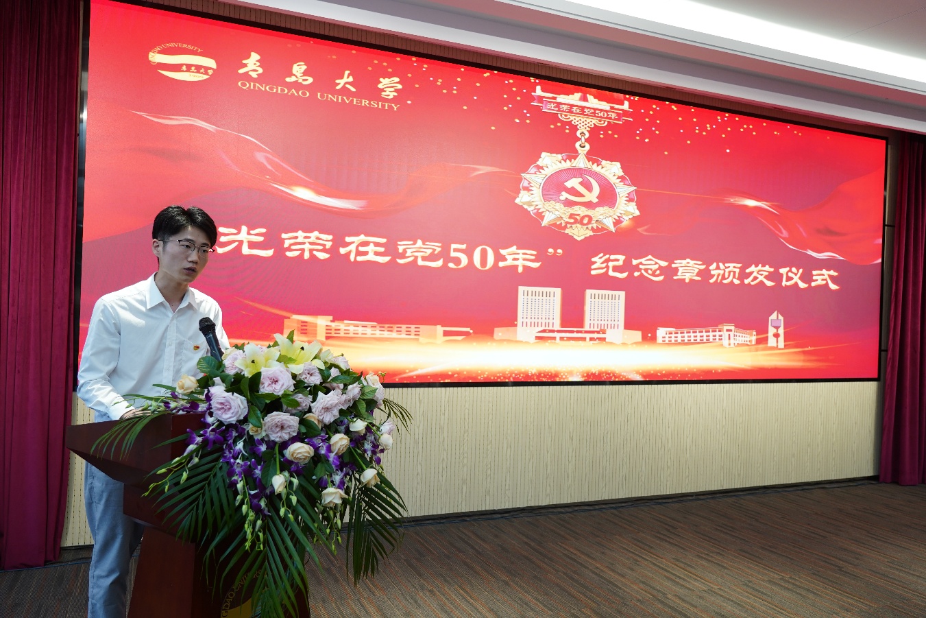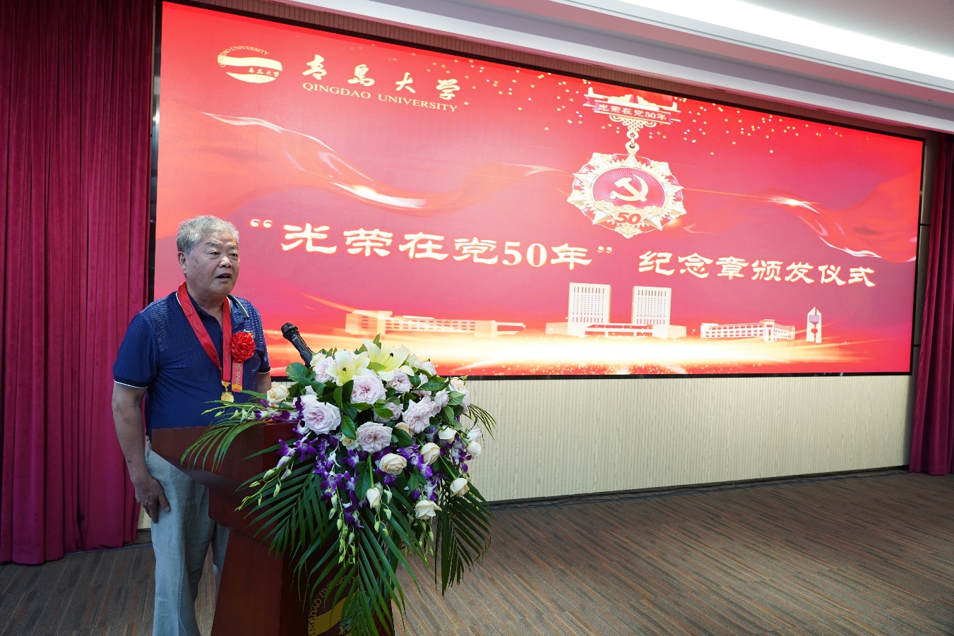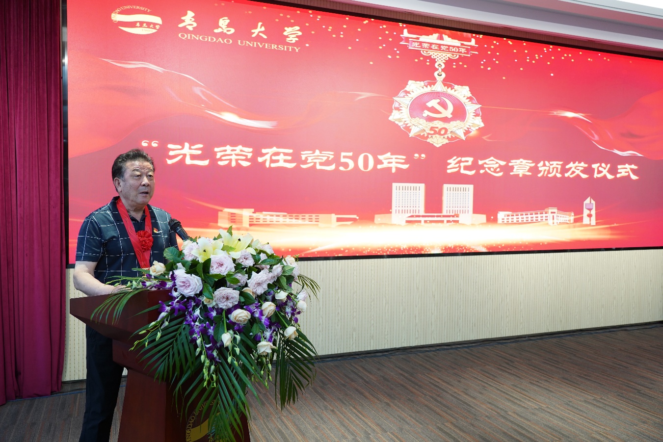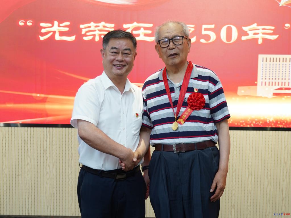 胡金焱代表校党委向全校获得纪念章的271位老党员表示热烈的祝贺和崇高的敬意。胡金焱指出,在庆祝中国共产党成立100周年的重要节点,党中央今年首次向党龄达到50周年、一贯表现良好的党员颁发“光荣在党50年”纪念章,充分体现了以习近平同志为核心的党中央对老党员的高度重视和亲切关怀。老党员们在各自岗位上勇挑重担、奋力拼搏,走在前、干在先,充分发挥了先锋模范作用,是青大历史的见证者和书写者。