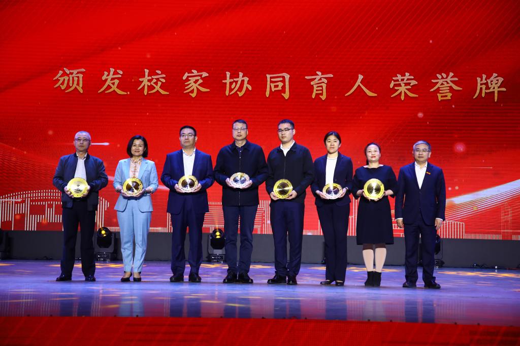 校党委书记胡金焱为特别邀请的7名获奖学子的家长赠送“校家协同育人荣誉牌”,校长夏东伟为青岛啤酒集团有限公司颁发“校企协同育人荣誉牌”。