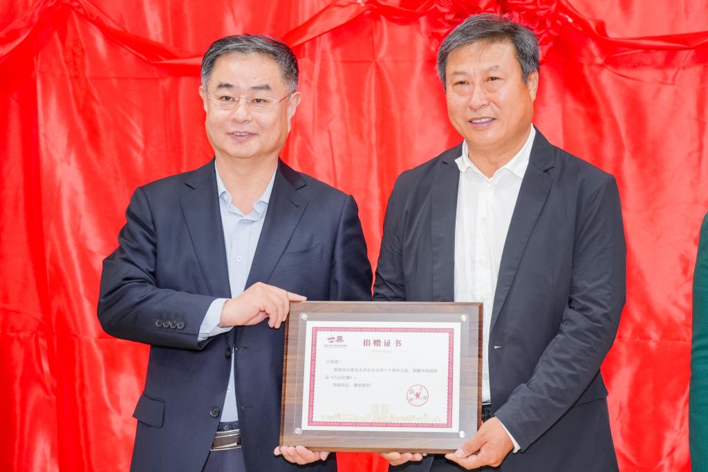 夏东伟与王绍波共同为画作《万山红遍》揭幕,并为王绍波颁发捐赠证书。