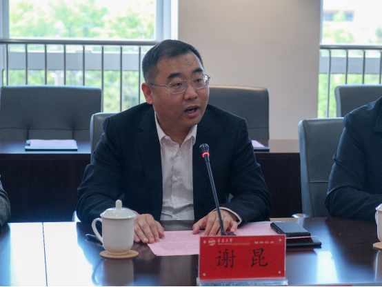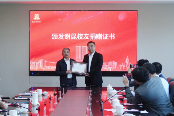 胡金焱代表学校向谢昆的慷慨捐赠表示衷心的感谢。胡金焱表示,谢昆及其所在公司,一直关心支持母校发展,在母校合并办学30周年之际,谢昆慷慨解囊支持学校事业发展,为学校献上一份厚礼,彰显了校友对母校的浓浓情谊、心系教育事业的家国情怀和社会担当。胡金焱阐述了学校校友工作的归属文化、感动文化、自豪文化、合作共赢文化、共享文化、资源整合文化等六大文化,介绍了学校三大平台、五大体系创新创业工作机制。胡书记提出,高校和校友要责任担当,加大力度开展校企合作、校社合作,相互成就,共同发展,希望有更多谢昆这样的校友,能够担任学校创新创业导师,加盟学校双创事业,经常回到母校与在校学生沟通交流,促进青年人才蓬勃发展。