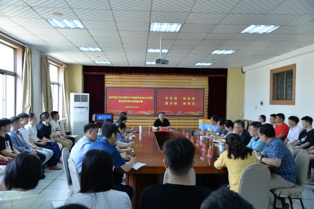 新闻网讯 6月16日下午,校长夏东伟以《深学笃用习近平新时代中国特色社会主义思想推动学校事业高质量发展》为题,在博知楼会议室为计算机科学技术学院师生代表讲授主题教育专题党课。学院党委书记潘秋鸿主持学习活动。