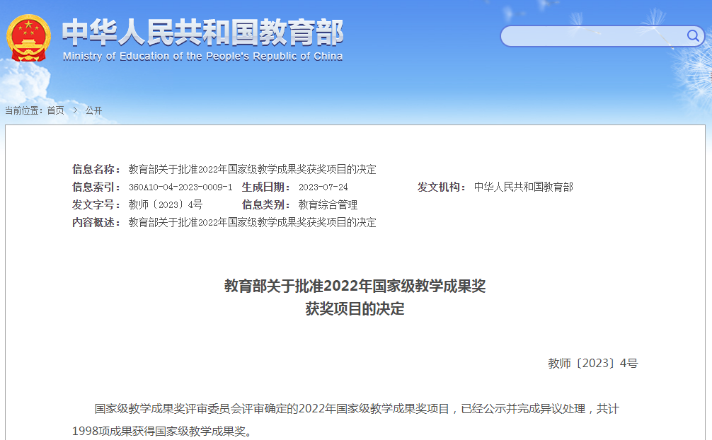 新闻网讯 7月24日,教育部发布了《教育部关于批准2022年国家级教学成果奖获奖项目的决定》,作为主持单位金年金共2项成果上榜,获奖数量位列山东省省属高校第一,取得新突破。