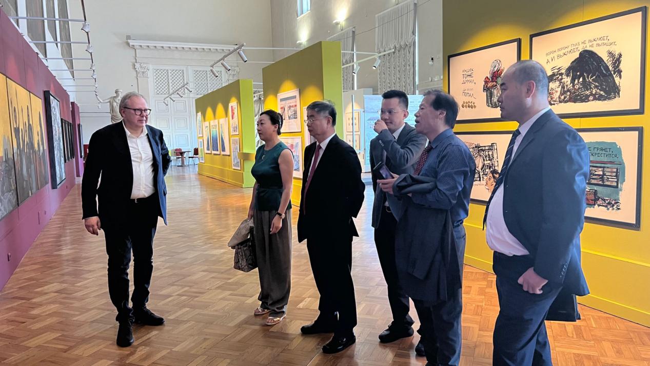 访问列宾美术学院期间,夏东伟与列宾美术学院院长谢苗·伊里奇分别介绍双方学校情况,谢苗·伊里奇院长陪同代表团参观了学院画廊和毕业生设计展,双方围绕两校在师生交流互访、研究生联合培养等方面深入交换了意见,并就合作申办中外合作办学项目进行了深入交流和探讨。