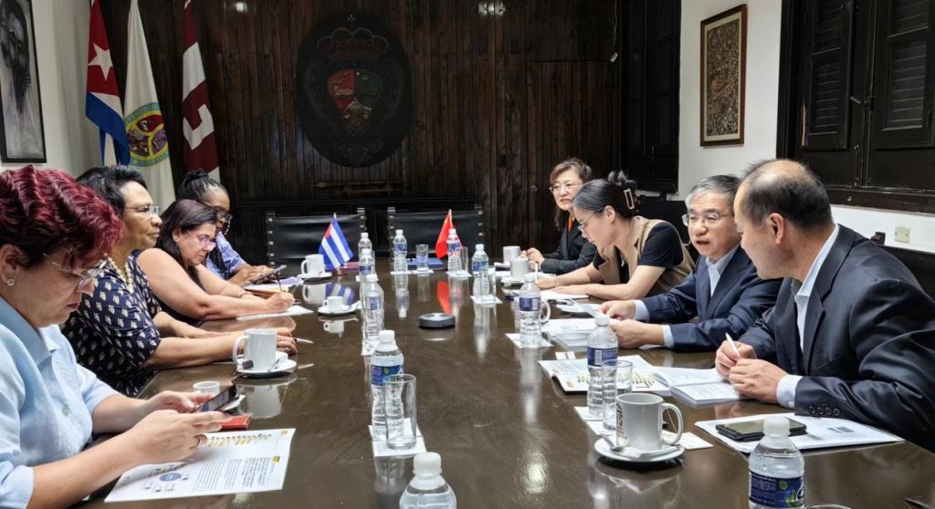胡金焱一行还分别与哈瓦那大学第一副校长赫尔南德兹(Marian Hernandez)和分管科研工作副校长阿隆索(Maday Alonso)等进行了工作会谈,与该校化学系、材料学院、生物材料中心、制药与食品学院、对外西班牙语系、孔子学院等相关学院(系)就具体合作事宜进行了广泛深入的交流。