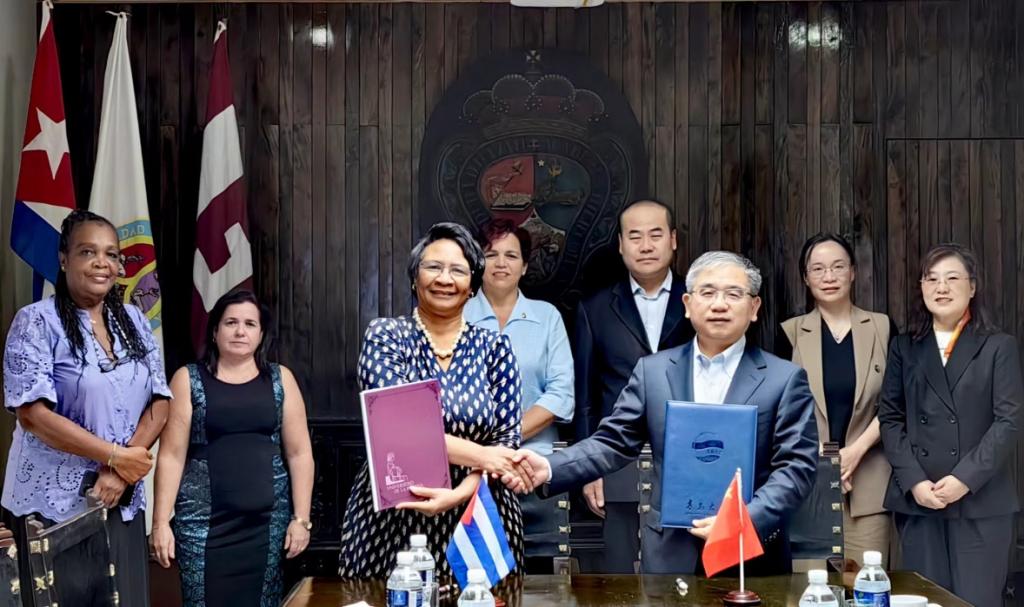 在古巴哈瓦那大学访问期间,胡金焱与该校校长加西亚(Miriam Nicado Garcia)举行了工作会谈,并签署了合作框架协议,为两校进一步合作奠定基础。双方在会谈中介绍了两校发展情况,就教育合作、人才培养和科研合作进行了探讨,双方决定在药学、化学和材料等领域探索开展科研合作,共同发表论文、合作申报国际科研项目。双方还将相互支持对方西班牙语和国际中文教育学科建设,加强教学方法研讨和教学资源的支持和交流。双方同意创造条件推动教师和学生的访问交流,同意合作开展政党研究,合作开展对中国社会经济问题研究和古巴问题研究,推动中古命运共同体建设。