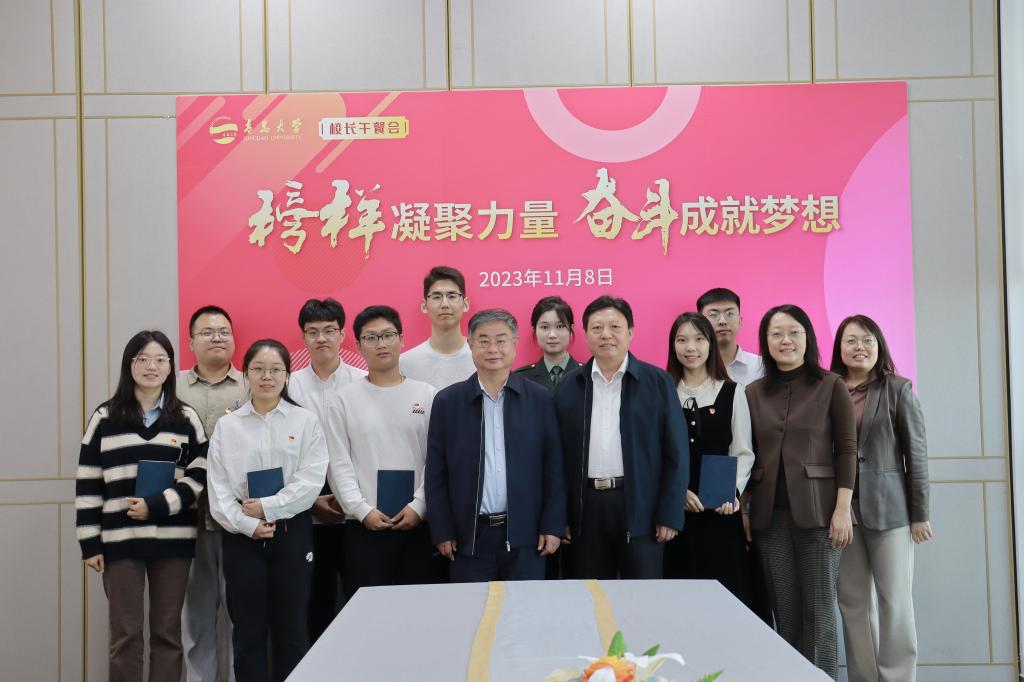 午餐会后,大家合影留念,夏东伟为同学们赠送写有“奋斗成就梦想”赠言的笔记本,同学们为夏东伟赠送纪念礼物。与会的文学与新闻传播学院吴闯表示回首在青大的四年生活,虽有辛苦,却让我收获良多,也正是有青大给予我们的平台,才让四年后的我得偿所愿、梦想成真。以后将延续青大精神,有力量的生长、有温度的传播,待学有所成时,回报和奉献母校。