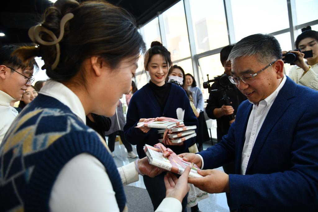 与会学生结合自己的专业畅谈自己对文化“两创”理解和认识,胡金焱给学生赠书《以史为鉴》,并题词勉励。