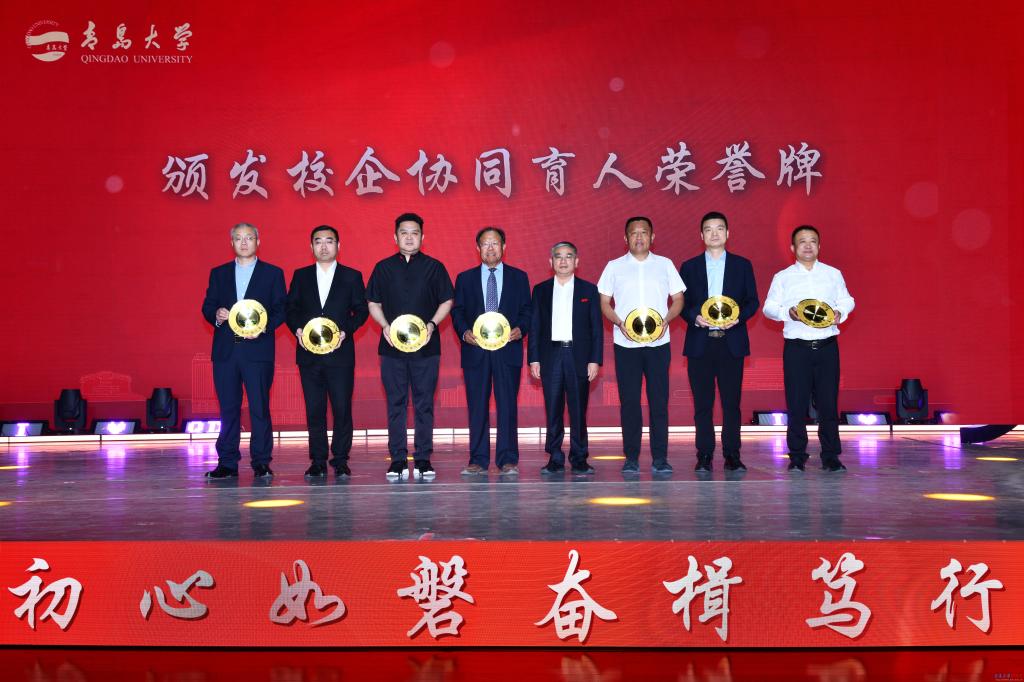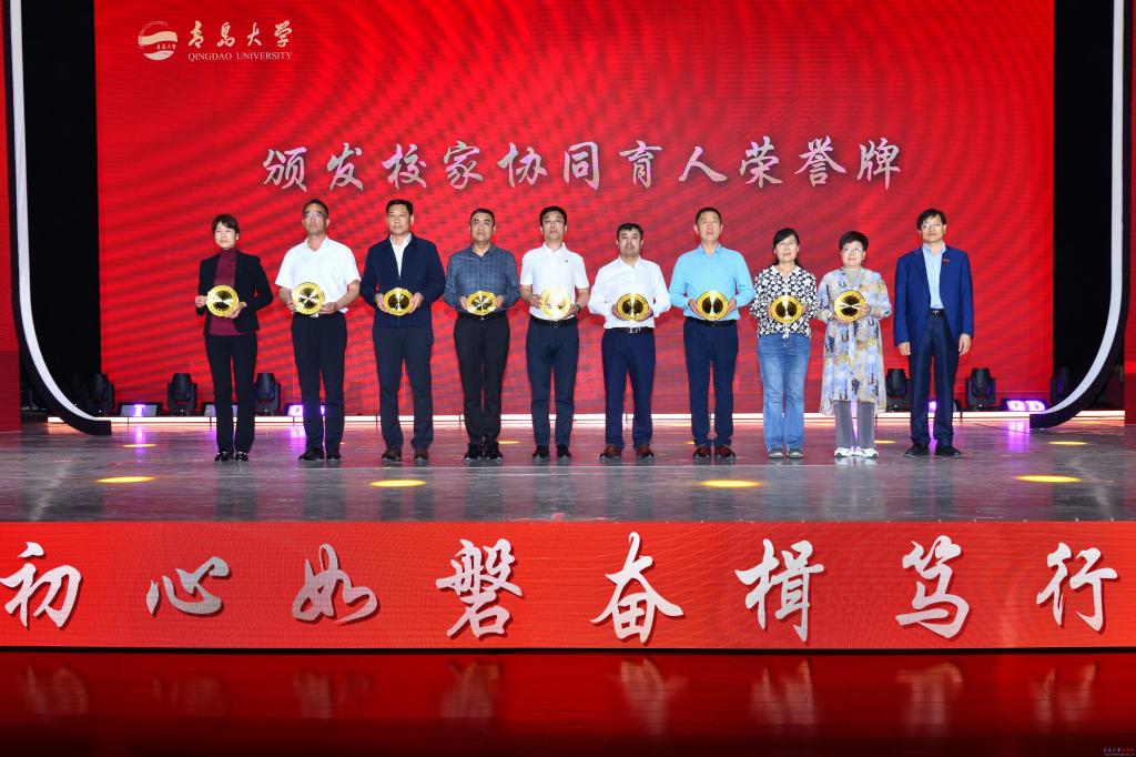 校党委书记胡金焱为青岛中仁健康产业集团有限公司等7家企业颁发“校企协同育人荣誉牌”,充分肯定企业勇担社会责任,在构建校企人才共育格局上作出的贡献。校长魏志强为9名获奖学子的家长颁发“校家协同育人荣誉牌”,对家长与学校同心协力,密切配合,共育英才表示感谢。