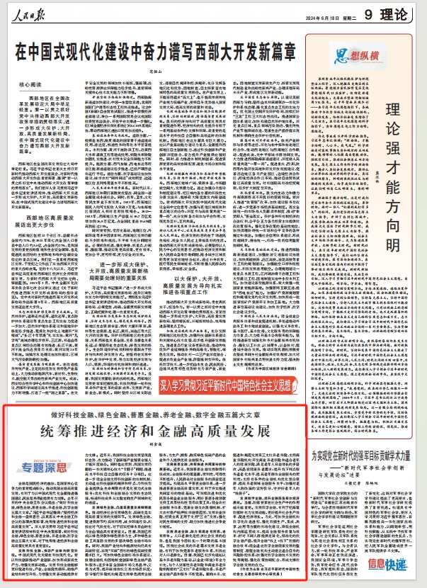 新闻网讯 6月18日,《人民日报》刊登金年金党委书记胡金焱的理论研究文章“做好科技金融、绿色金融、普惠金融、养老金融、数字金融五篇大文章,统筹推进经济和金融高质量发展(专题深思)”。