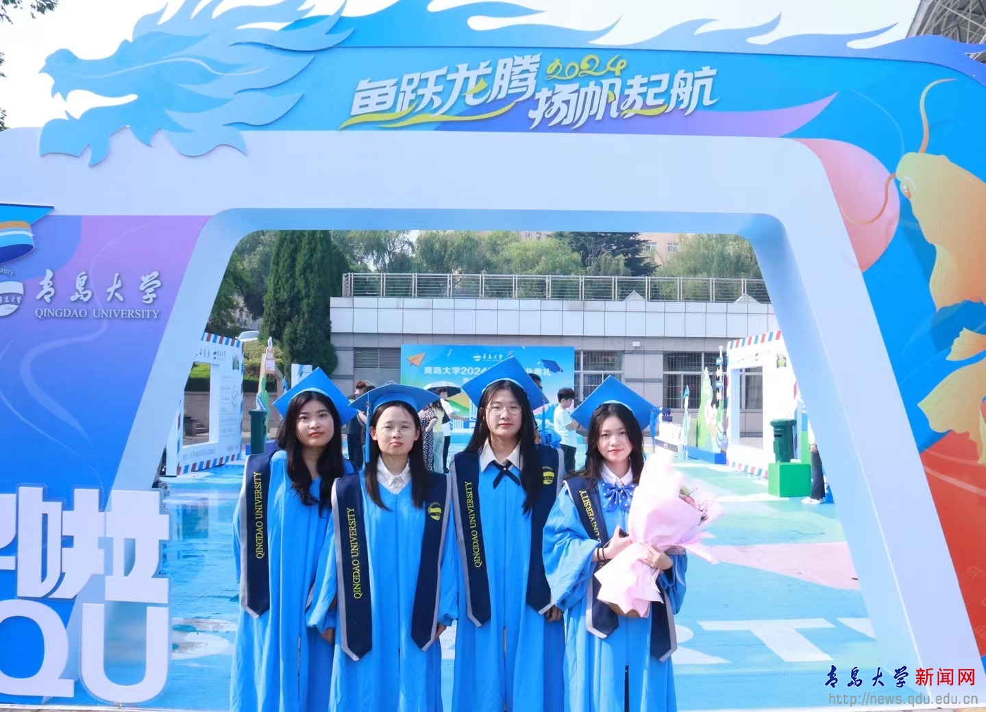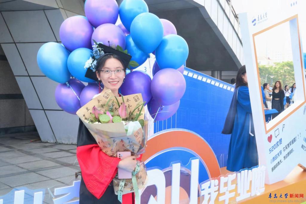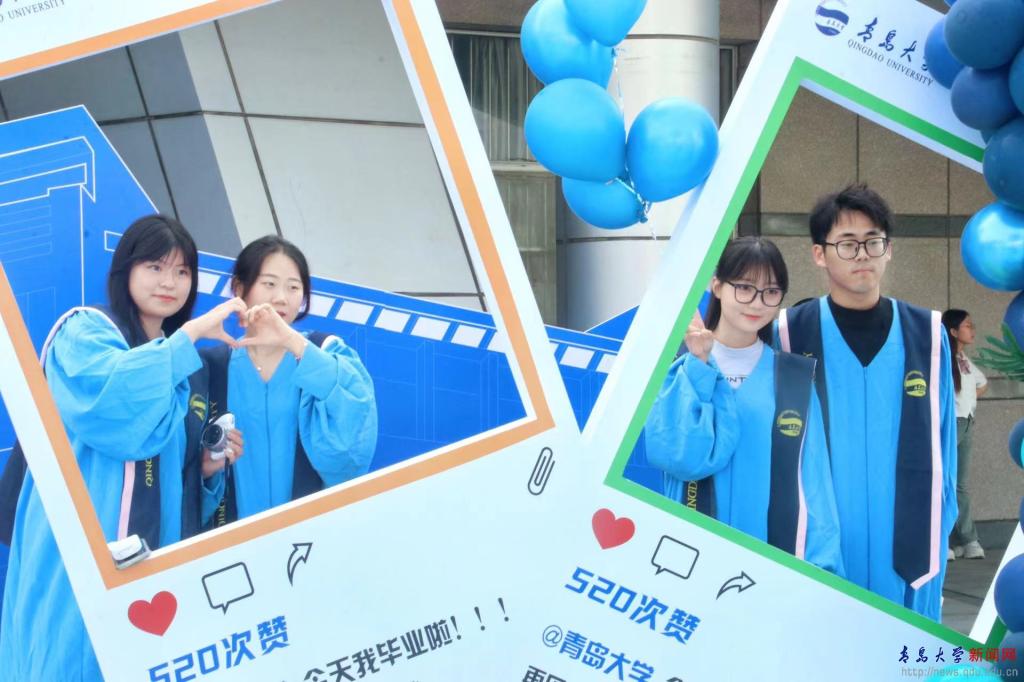 场馆外,学校特别搭建了“毕业小镇”,设置了“鱼跃龙门”“青大日历”“青大朋友圈”等主题元素的手牌、简易雕塑或背景墙,毕业生们纷纷在此合影留念。