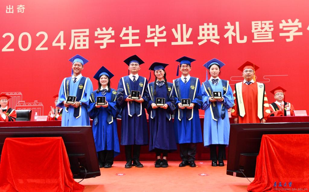 毕业典礼上,胡金焱为2024届省级优秀毕业生代表颁奖。魏志强为2024年基层就业毕业生代表颁发荣誉纪念章。