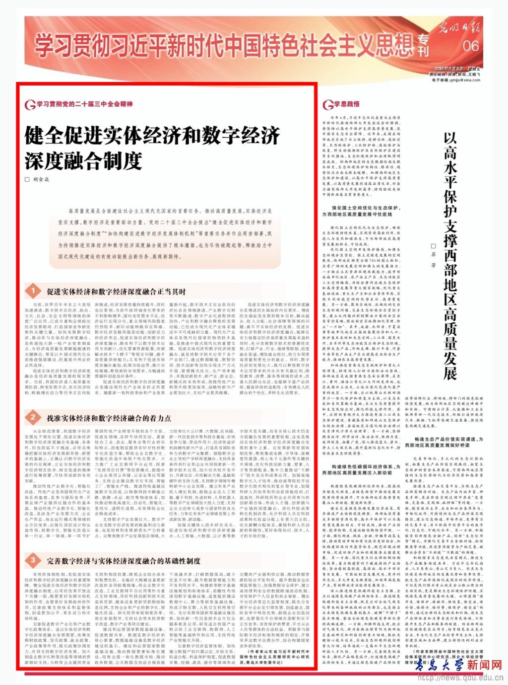 新闻网讯 8月2日,《光明日报》刊登金年金党委书记胡金焱关于“学习贯彻党的二十届三中全会精神”专题文章《健全促进实体经济和数字经济深度融合制度》。