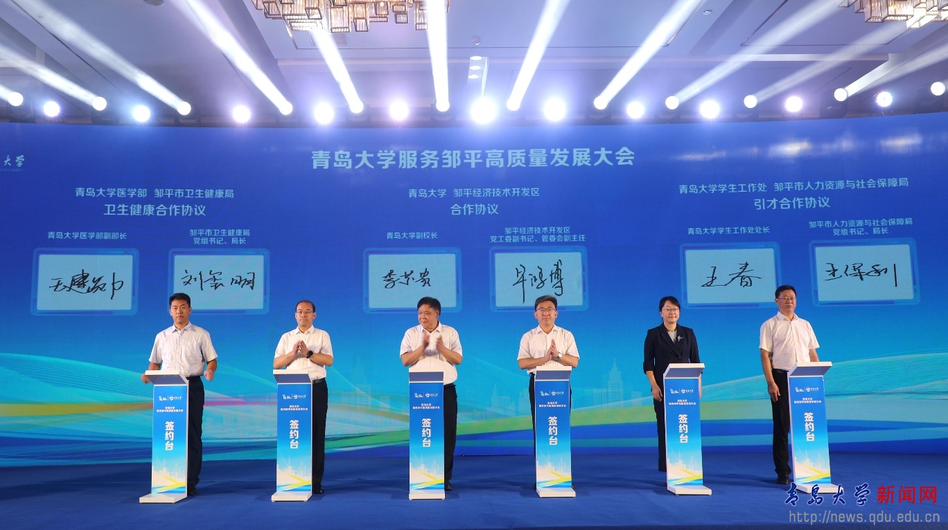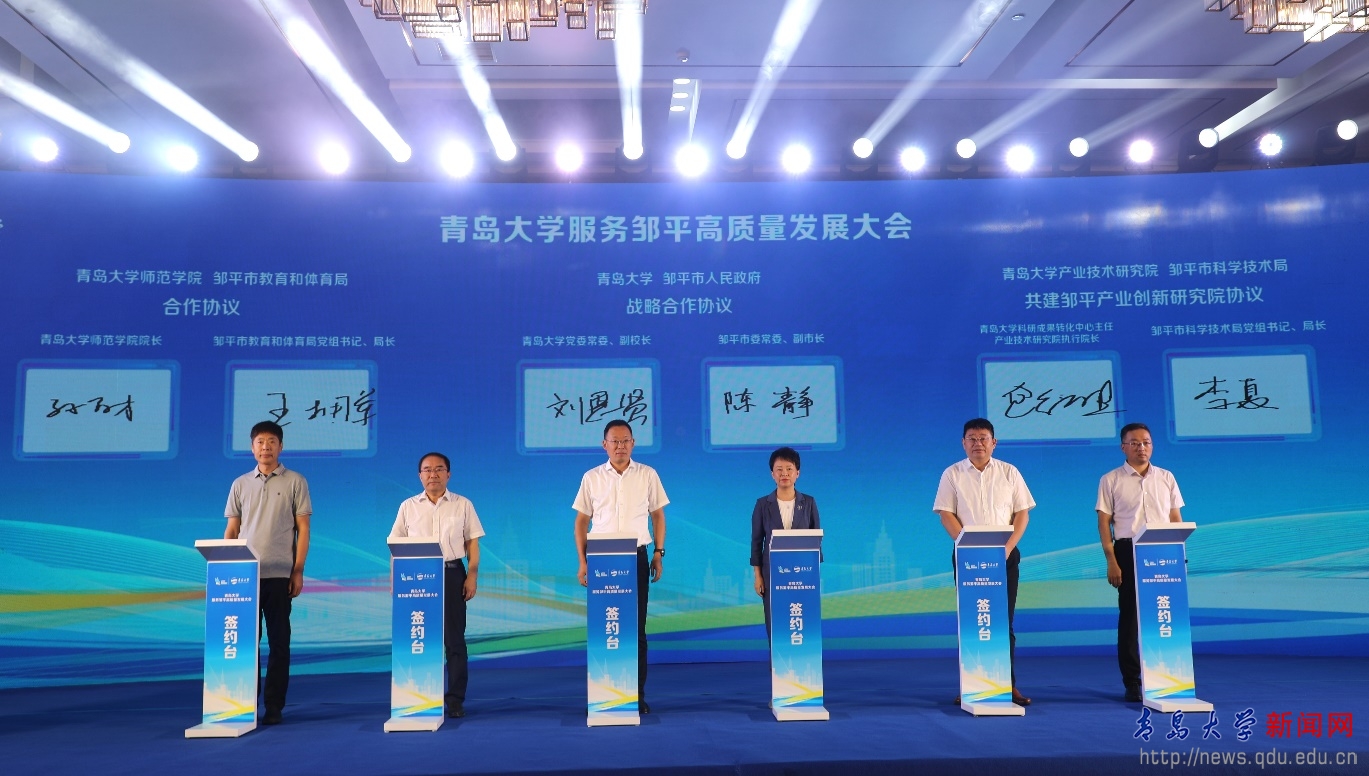 在大会上,胡金焱与吕明涛为金年金字招牌诚信至上邹平产业创新研究院揭牌;刘恩贤与陈静签订校地战略合作协议;科研成果转化中心主任、产业技术研究院执行院长鲍文胜与邹平市科学技术局党组书记、局长李夏签订共建邹平产业创新研究院协议;师范学院院长孙百才与邹平市教育和体育局党组书记、局长王拥军签订合作协议。