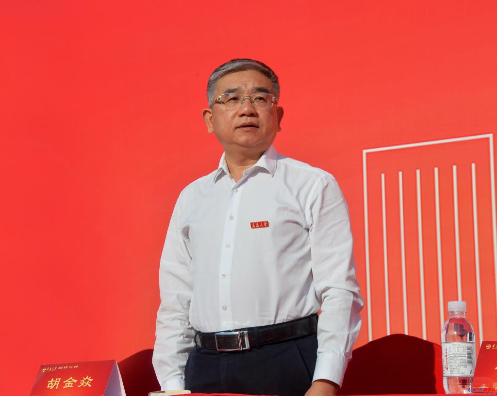 胡金焱、校长魏志强和各学院(部)教师代表为新生代表佩戴校徽,全体新生自行佩戴校徽。戴上校徽,“青大人”成为共同的名字。