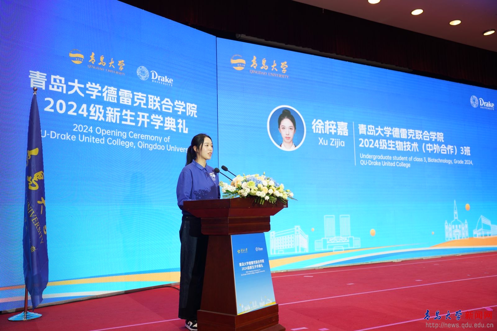 德雷克联合学院教师代表李臻,2024级新生代表徐梓嘉先后发言。李臻对同学们的大学学习、生活提出了宝贵建议,希望新生们加强信心勇气,积累经验,持之以恒探索科学奥秘。徐梓嘉分享自己对于生物专业的热爱和对大学生活的期待,号召与同学们一起尽快适应大学生活,明确目标,抓住机遇。