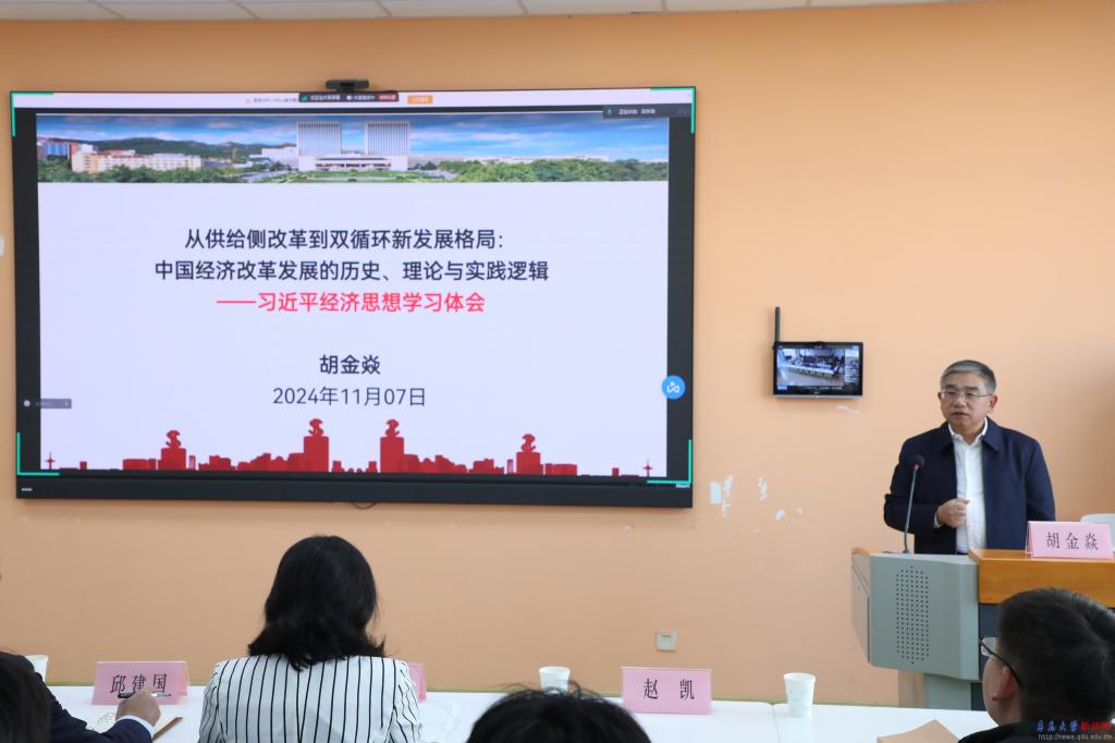 新闻网讯 11月7日,为深入学习贯彻党的二十届三中全会和全国教育大会精神,校党委书记胡金焱在金家岭校区守实楼423教室为经济学院师生讲授思政课。经济学院2023级本科生及学院领导班子成员现场聆听思政课,其他师生线上参加学习。