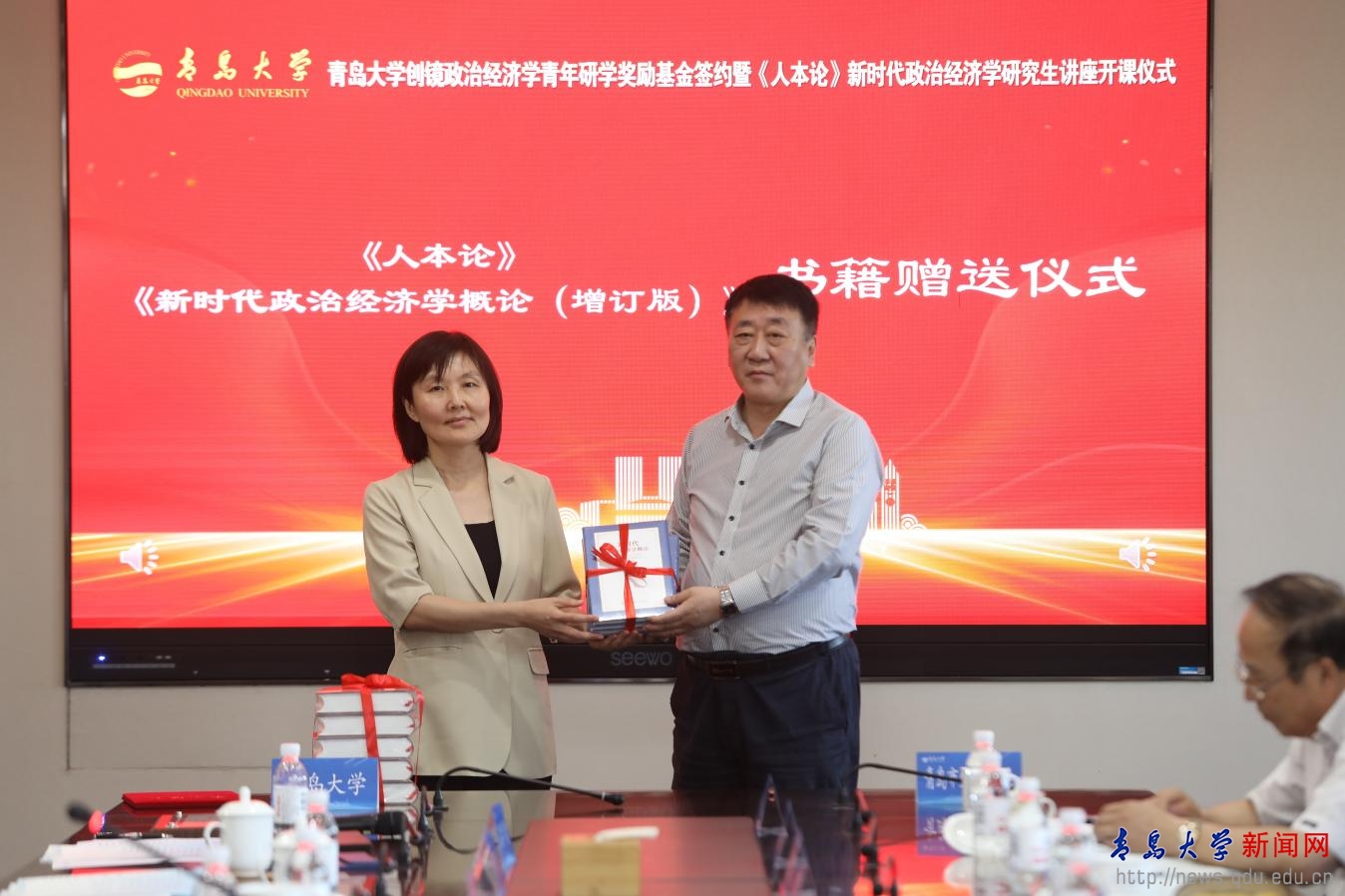 金年金字招牌诚信至上职业经理人学院院长马卫刚与图书馆党委书记、馆长陆婕进行《人本论》《新时代政治经济学概论(增订版)》书籍赠送仪式。