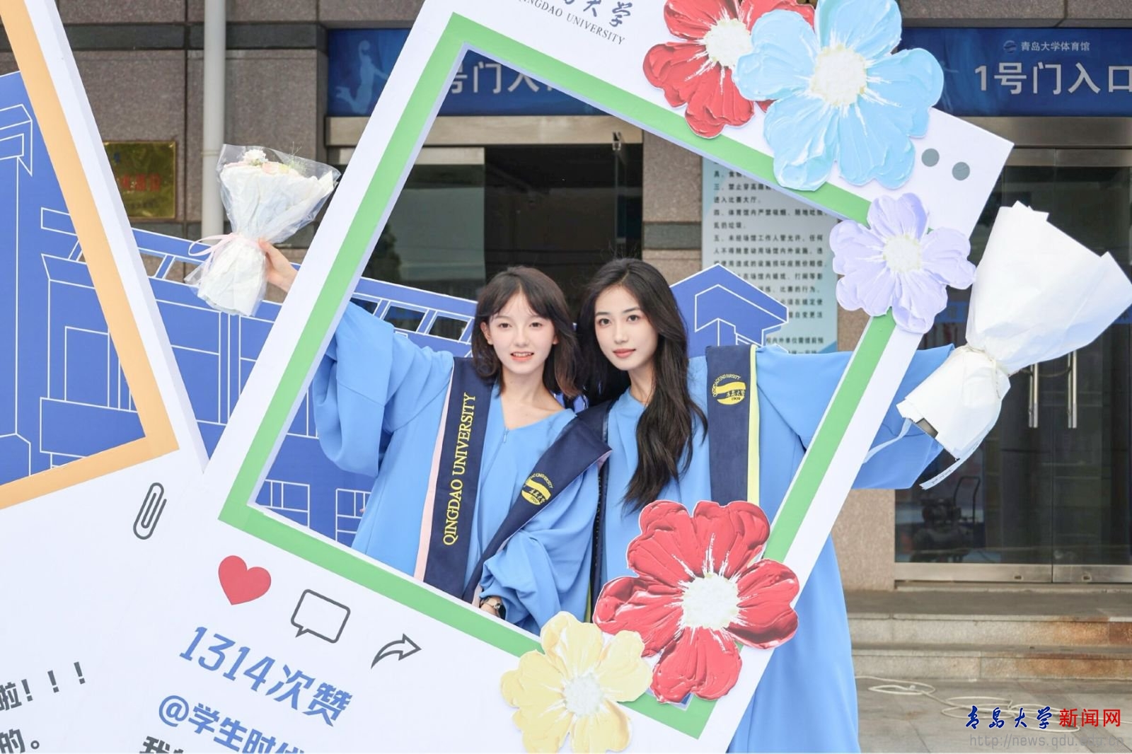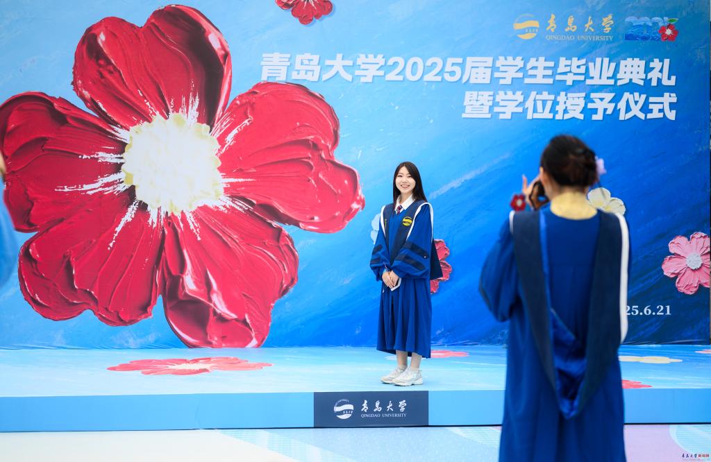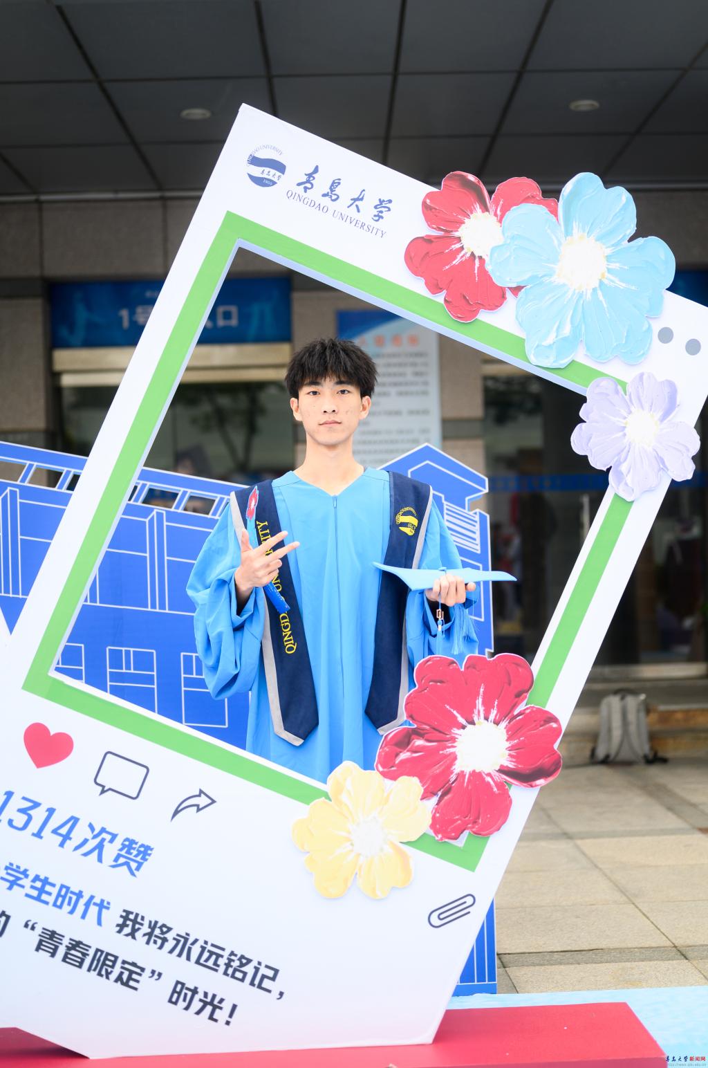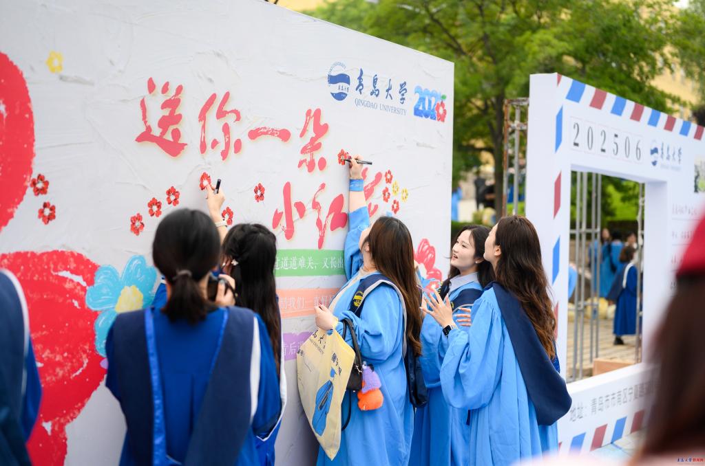 场馆外,学校特别搭建了“毕业小镇”,以“一路生花”为主题,设置了花朵拱门、签名墙、青大信笺、青大日历、青大朋友圈等多个带有“小红花”元素的拍照打卡点,毕业生们纷纷在此合影留念。