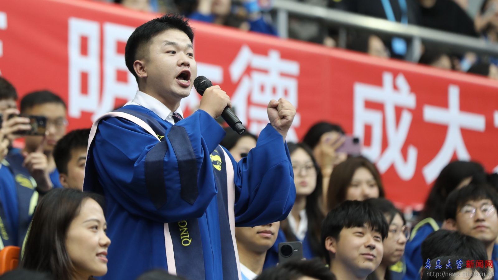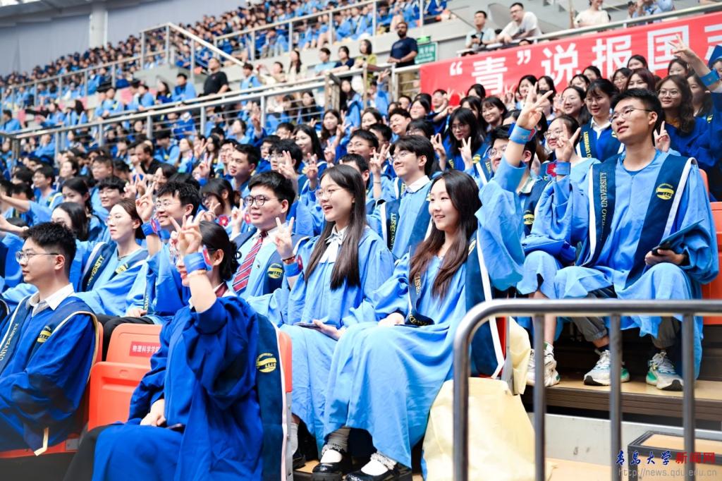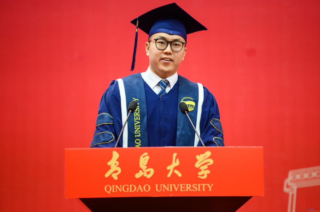 毕业生代表青岛医学院张豪讲述了他的学术攀登之路,希望同学们怀揣向上攀登的勇气、智慧与赤诚,乘风破浪,一往无前,共同续写属于新时代青年的辉煌篇章。