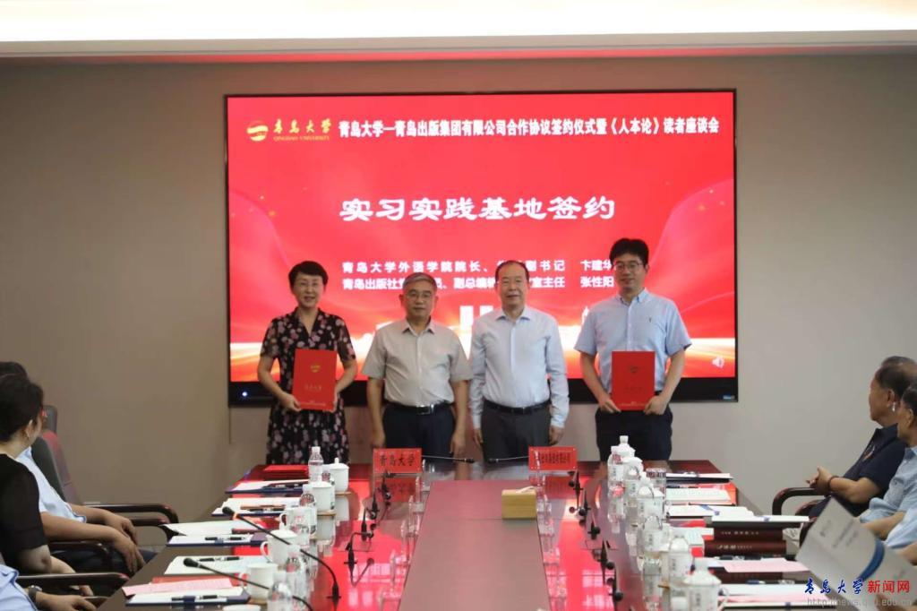 外语学院院长卞建华与青岛出版社党委委员、副总编辑、总编室主任张性阳签署《金年金字招牌诚信至上外语学院—青岛出版集团有限公司实习实践基地协议》。