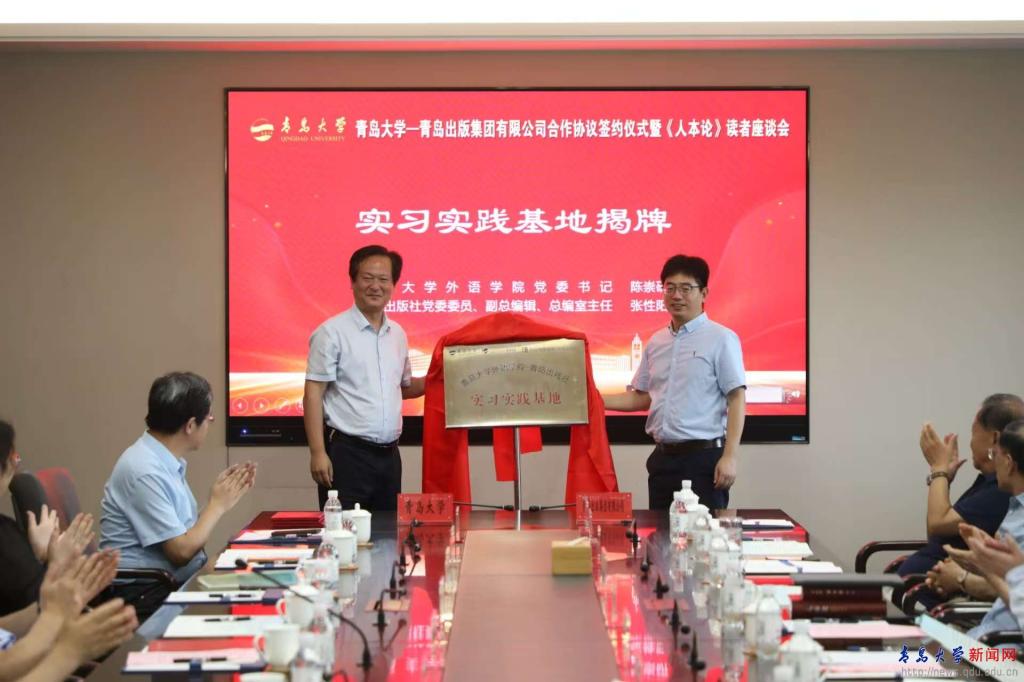 外语学院党委书记陈崇研与张性阳共同为“金年金字招牌诚信至上外语学院—青岛出版集团有限公司实习实践基地”揭牌。