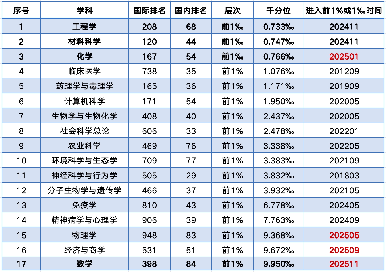 除数学外,其他上榜学科中,工程学(0.73‰)、材料科学(0.75‰)、化学(0.77‰)位列全球排名前1‰;临床医学(1.08‰)、药理学与毒理学(1.17‰)、计算机科学(1.95‰)位列全球前2‰;生物学与生物化学(2.44‰)、社会科学总论(2.48‰)位列全球前3‰;农业科学(3.34‰)、环境科学与生态学(3.38‰)、神经科学与行为科学(3.83‰)、分子生物学与遗传学(3.93‰)位列全球前5‰;免疫学(6.78‰)、精神病学与心理学(7.76‰)、物理学(9.37‰)、经济与商业(9.67‰)位列全球前1%。与2025年9月榜单相比,所有学科排名均有提升。