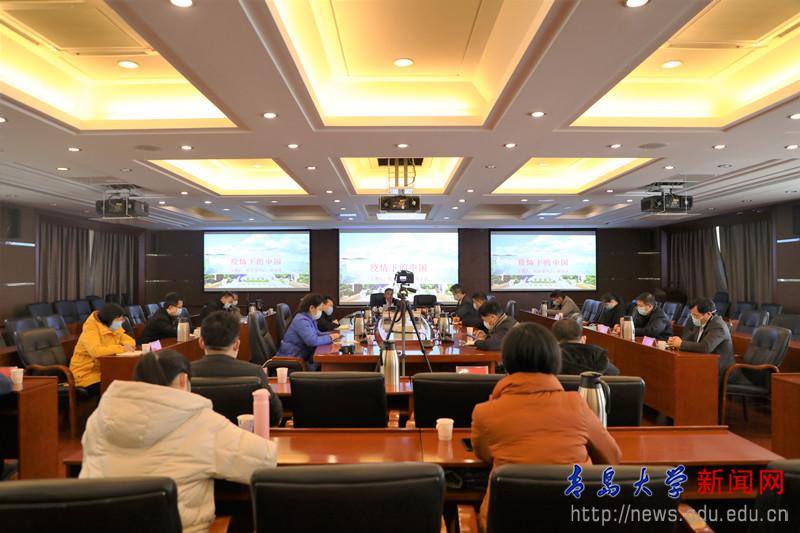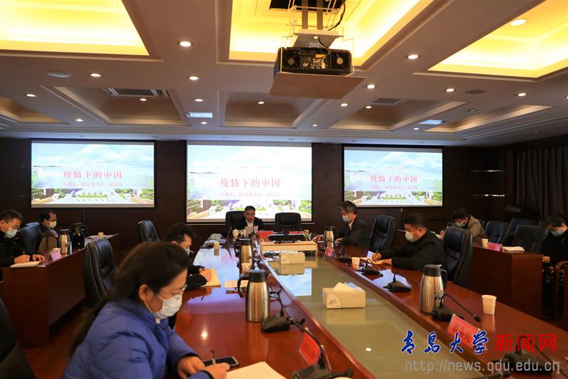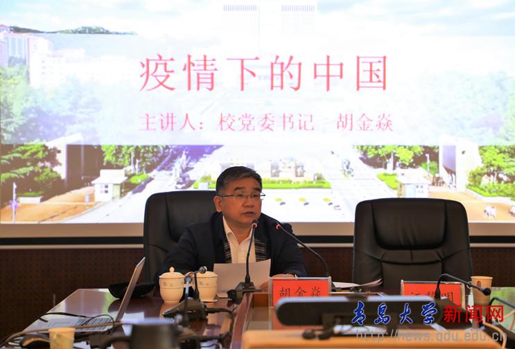 在谈到看看党和政府是如何指挥和领导这场疫情总体战、阻击战,学校是如何落实和应对疫情防控时,胡金焱全面介绍了疫情发生后,党中央是如何快速做出决策部署和集中统一领导的,习近平总书记是如何亲自指挥、亲自部署、亲自带领全国人民顽强战“疫”的,中央应对疫情工作领导小组是如何靠前指挥抗“疫”的,他还介绍了山东省、青岛市和学校在应对疫情中的有关部署和具体举措。他表示,当前全国疫情蔓延势头得到了初步遏制,防控工作取得了阶段性成效,实践证明,党中央对疫情形势的判断是准确的,各项工作部署是及时的,采取的举措是有力有效的。他强调,要按照总书记的指示精神,在当前阶段决不能有丝毫的麻痹思想、侥幸心理和工作懈怠,但也要充分相信,在党中央的坚强领导下,在各级政府和全国人民的共同努力下,取得这场疫情防控人民战争的全面胜利指日可待。