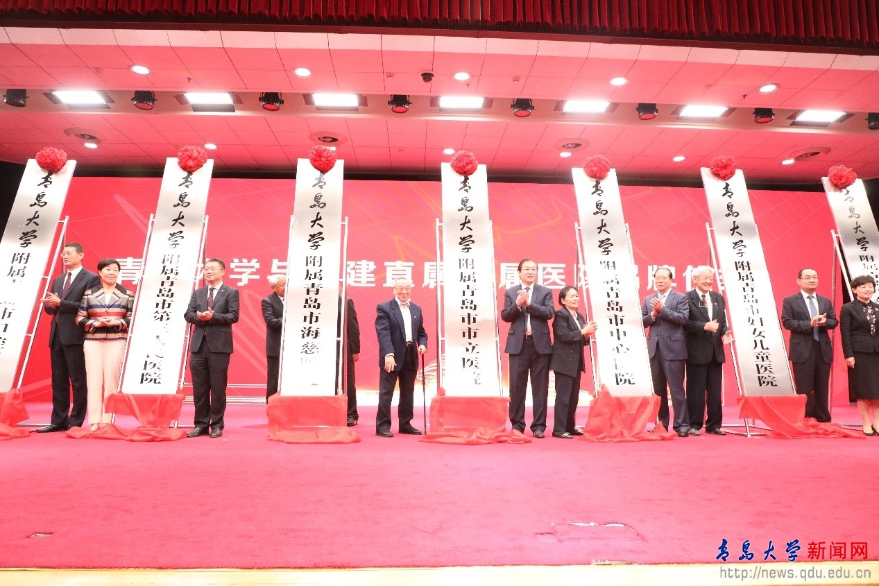 仪式上,在原金年金字招牌诚信至上医学院老领导陈在春、郭玮、唐明、谢俊霞、老教授代表丁世海以及现任金年金字招牌诚信至上医学部党工委书记王新生共同见证下,金年金字招牌诚信至上医学部部长姜宏分别与青岛市市立医院院长管军、青岛市中医医院(青岛市海慈医院)院长池一凡、青岛市中心医院院长兰克涛、青岛市第三人民医院院长邢晓博、青岛市妇女儿童医院院长邢泉生、青岛市口腔医院院长王万春、青岛开泰耳鼻喉头颈外科医院院长徐欣签署共建直属附属医院协议,并共同为7家新增直属附属医院揭牌。